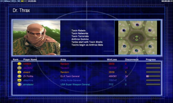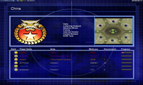 | NameHAMZA | Side | Color | Team0 | Starting Position0 | Buildings Built10 | Buildings Lost0 | Buildings Destroyed0 | Units Built24 | Units Lost0 | Units Destroyed10 | Money Earned21000 | OutcomeLost |