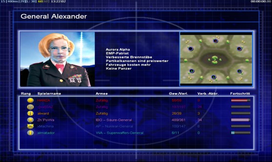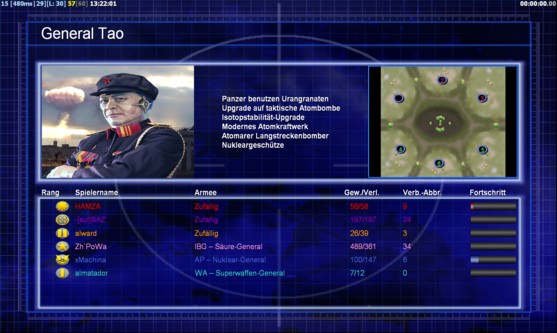 | Name-[sul]SAZ | Side | Color | Team0 | Starting Position5 | Buildings Built10 | Buildings Lost0 | Buildings Destroyed0 | Units Built36 | Units Lost0 | Units Destroyed10 | Money Earned13625 | OutcomeLost |