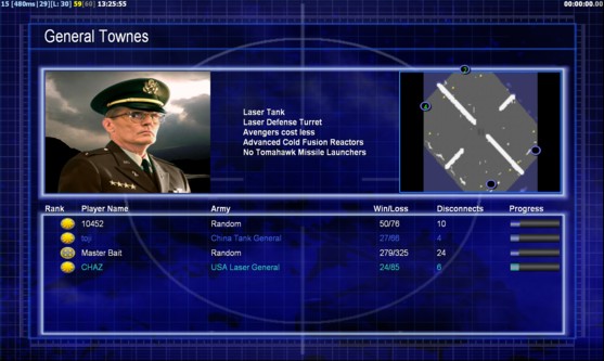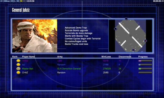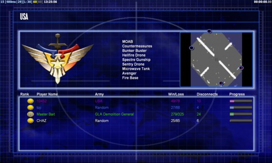 | Name | Side | Color | Team | Starting Position | Buildings Built | Buildings Lost | Buildings Destroyed | Units Built | Units Lost | Units Destroyed | Money Earned | Outcome |