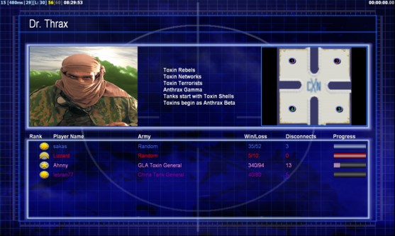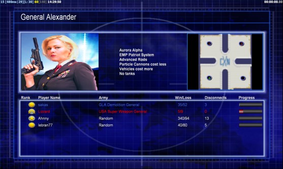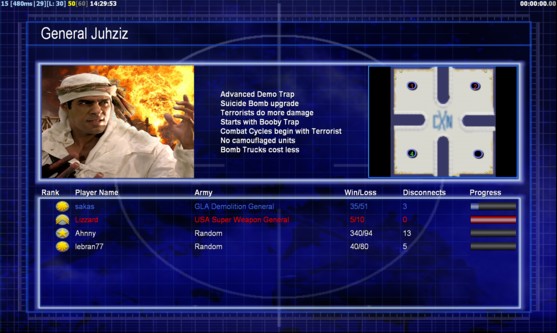 | NameLizzard | Side | Color | Team0 | Starting Position0 | Buildings Built5 | Buildings Lost0 | Buildings Destroyed0 | Units Built10 | Units Lost0 | Units Destroyed0 | Money Earned0 | OutcomeLost |