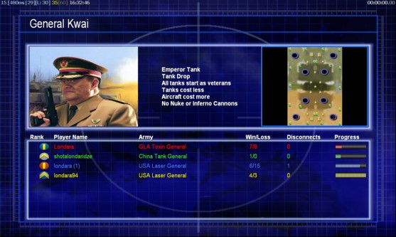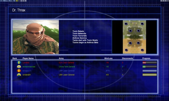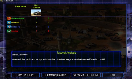 | Name | Side | Color | Team | Starting Position | Buildings Built | Buildings Lost | Buildings Destroyed | Units Built | Units Lost | Units Destroyed | Money Earned | Outcome |