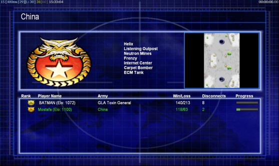 | Name | Side | Color | Team | Starting Position | Buildings Built | Buildings Lost | Buildings Destroyed | Units Built | Units Lost | Units Destroyed | Money Earned | Outcome |