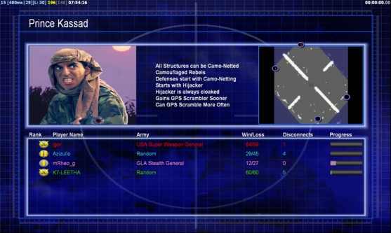 | Name | Side | Color | Team | Starting Position | Buildings Built | Buildings Lost | Buildings Destroyed | Units Built | Units Lost | Units Destroyed | Money Earned | Outcome |