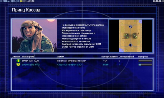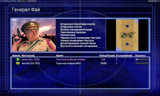 | Name | Side | Color | Team | Starting Position | Buildings Built | Buildings Lost | Buildings Destroyed | Units Built | Units Lost | Units Destroyed | Money Earned | Outcome |