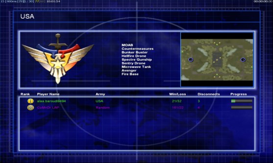 | Namealaa.baroudi9494 | Side | Color | TeamNone | Starting PositionNone | Buildings Built7 | Buildings Lost0 | Buildings Destroyed0 | Units Built21 | Units Lost0 | Units Destroyed6 | Money Earned12000 | OutcomeLost |