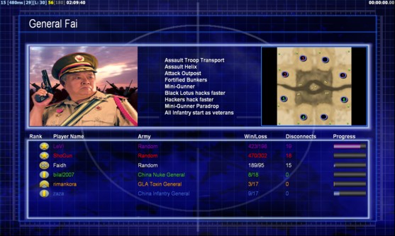 | Name | Side | Color | Team | Starting Position | Buildings Built | Buildings Lost | Buildings Destroyed | Units Built | Units Lost | Units Destroyed | Money Earned | Outcome |