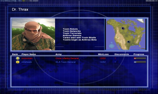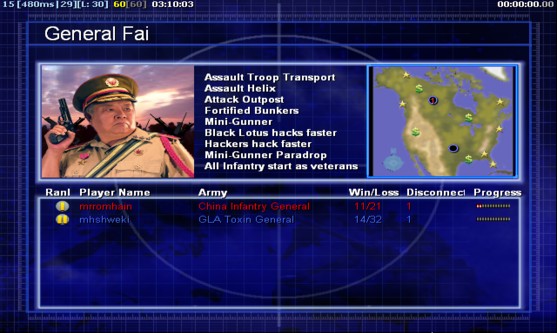 | Name | Side | Color | Team | Starting Position | Buildings Built | Buildings Lost | Buildings Destroyed | Units Built | Units Lost | Units Destroyed | Money Earned | Outcome |