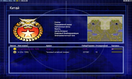 | Name | Side | Color | Team | Starting Position | Buildings Built | Buildings Lost | Buildings Destroyed | Units Built | Units Lost | Units Destroyed | Money Earned | Outcome |