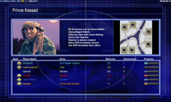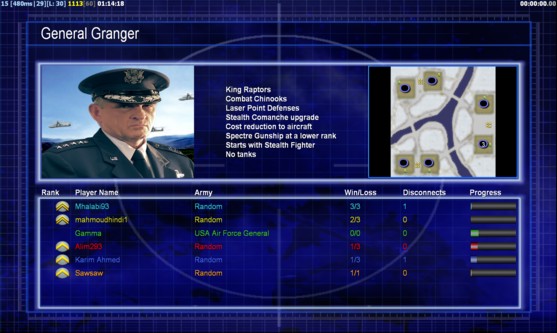 | Name | Side | Color | Team | Starting Position | Buildings Built | Buildings Lost | Buildings Destroyed | Units Built | Units Lost | Units Destroyed | Money Earned | Outcome |