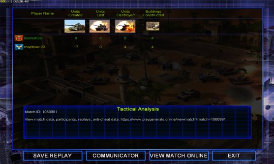 | Name | Side | Color | Team | Starting Position | Buildings Built | Buildings Lost | Buildings Destroyed | Units Built | Units Lost | Units Destroyed | Money Earned | Outcome |