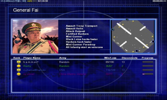 | Name | Side | Color | Team | Starting Position | Buildings Built | Buildings Lost | Buildings Destroyed | Units Built | Units Lost | Units Destroyed | Money Earned | Outcome |
