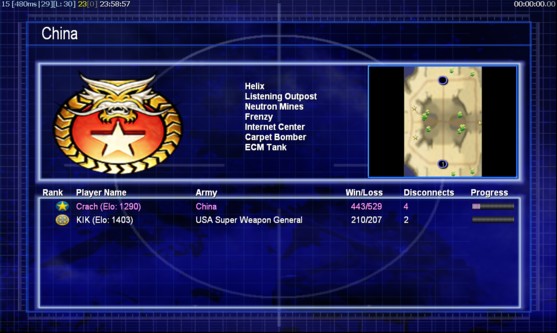 | Name | Side | Color | Team | Starting Position | Buildings Built | Buildings Lost | Buildings Destroyed | Units Built | Units Lost | Units Destroyed | Money Earned | Outcome |