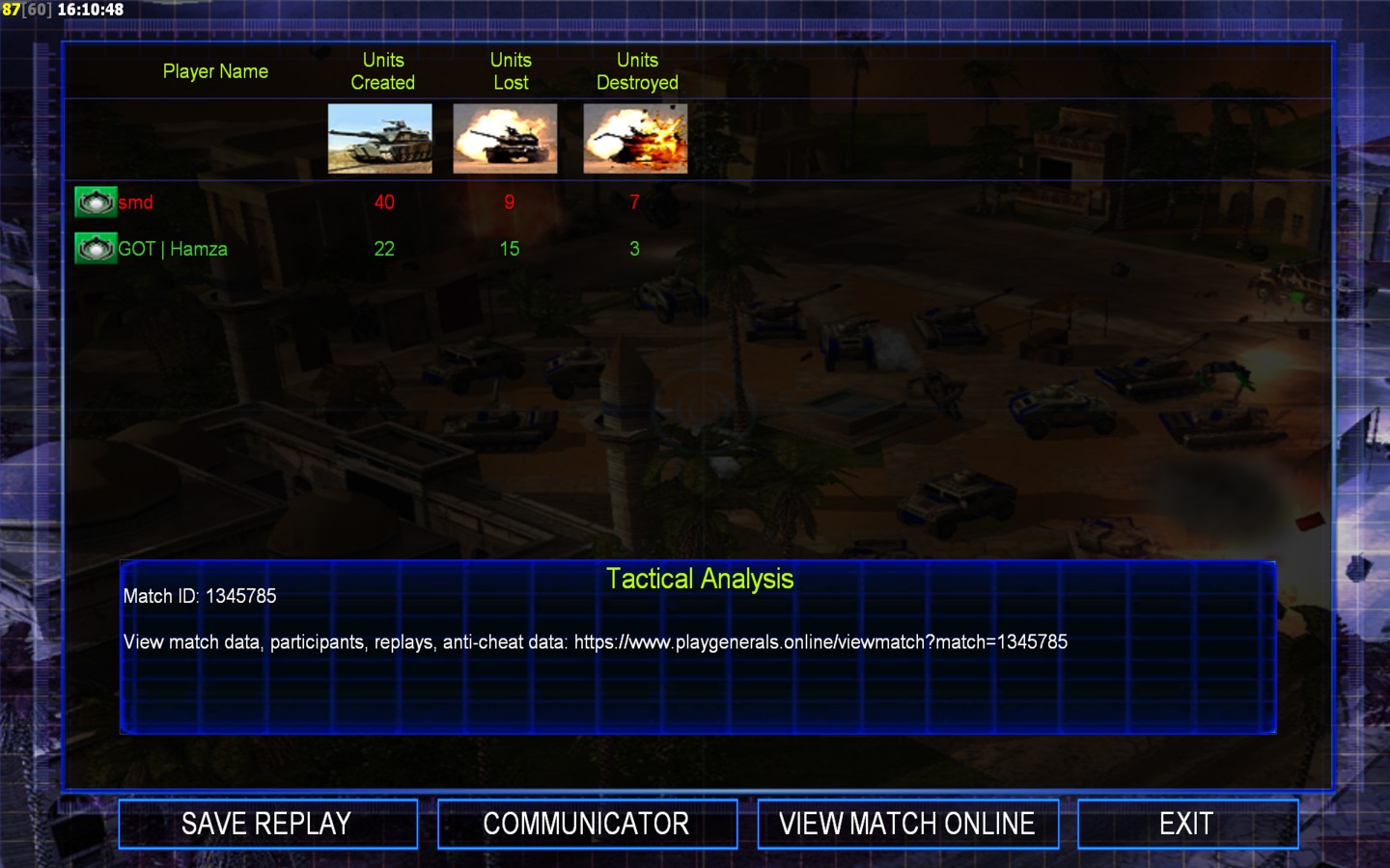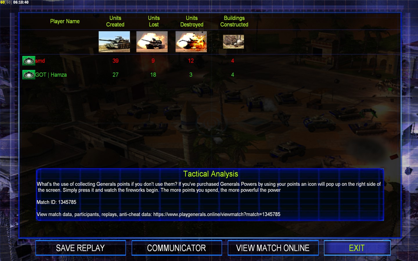 | Name | Side | Color | Team | Starting Position | Buildings Built | Buildings Lost | Buildings Destroyed | Units Built | Units Lost | Units Destroyed | Money Earned | Outcome |