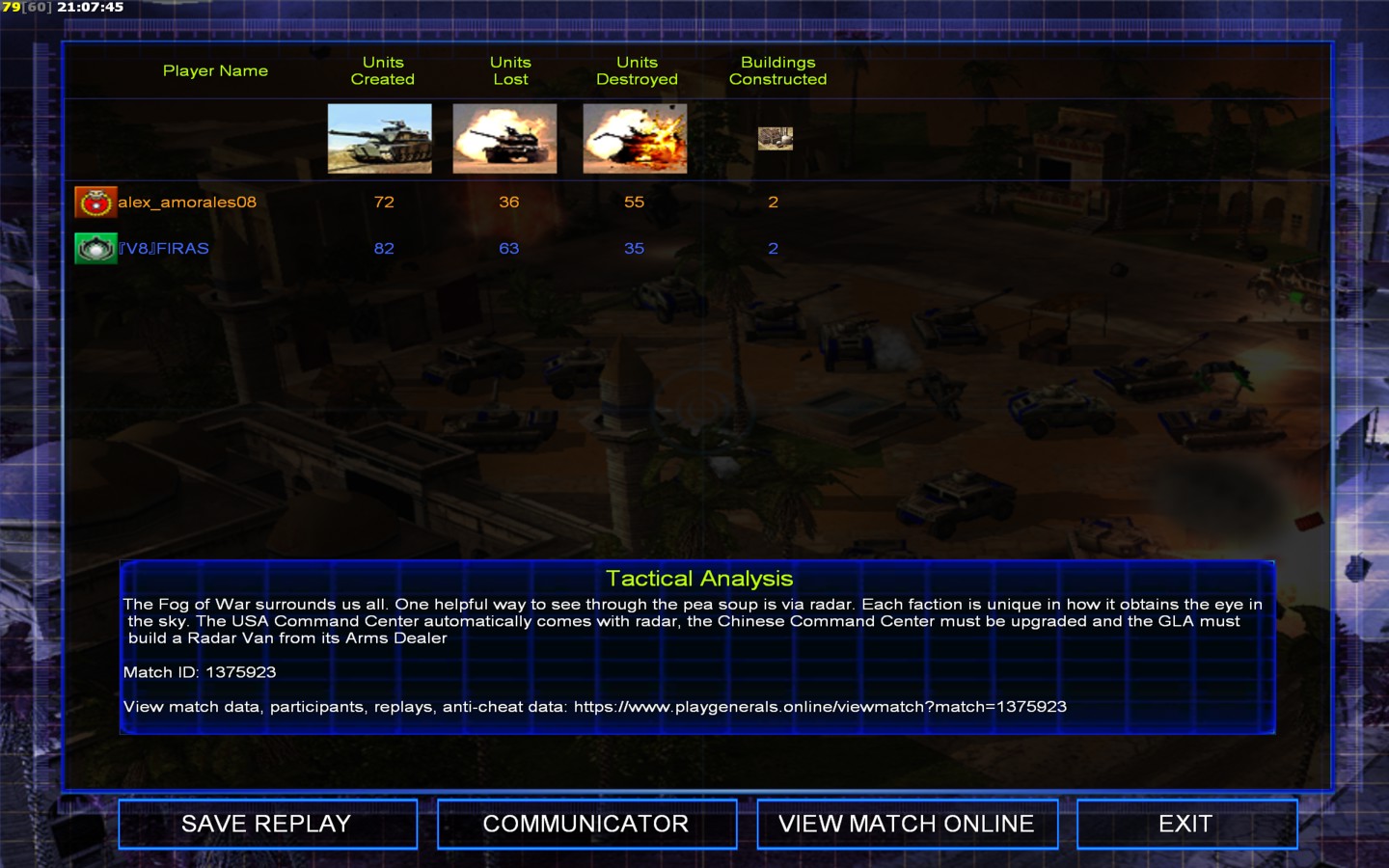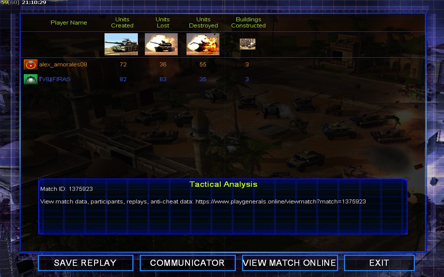 Color | TeamNone | Starting PositionNone | Buildings Built20 | Buildings Lost3 | Buildings Destroyed1 | Units Built82 | Units Lost63 | Units Destroyed35 | Money Earned62425 | OutcomeLost |