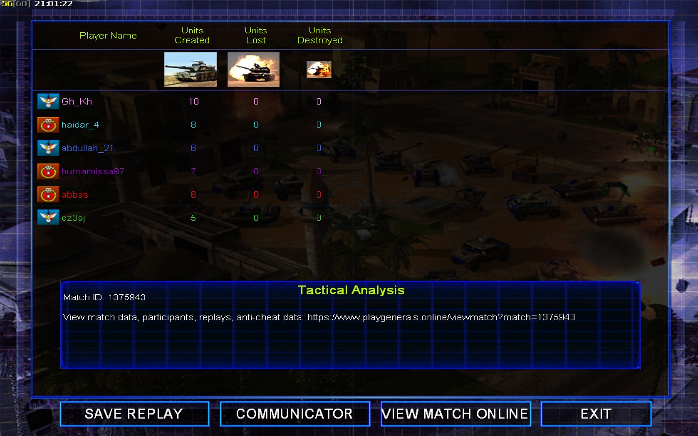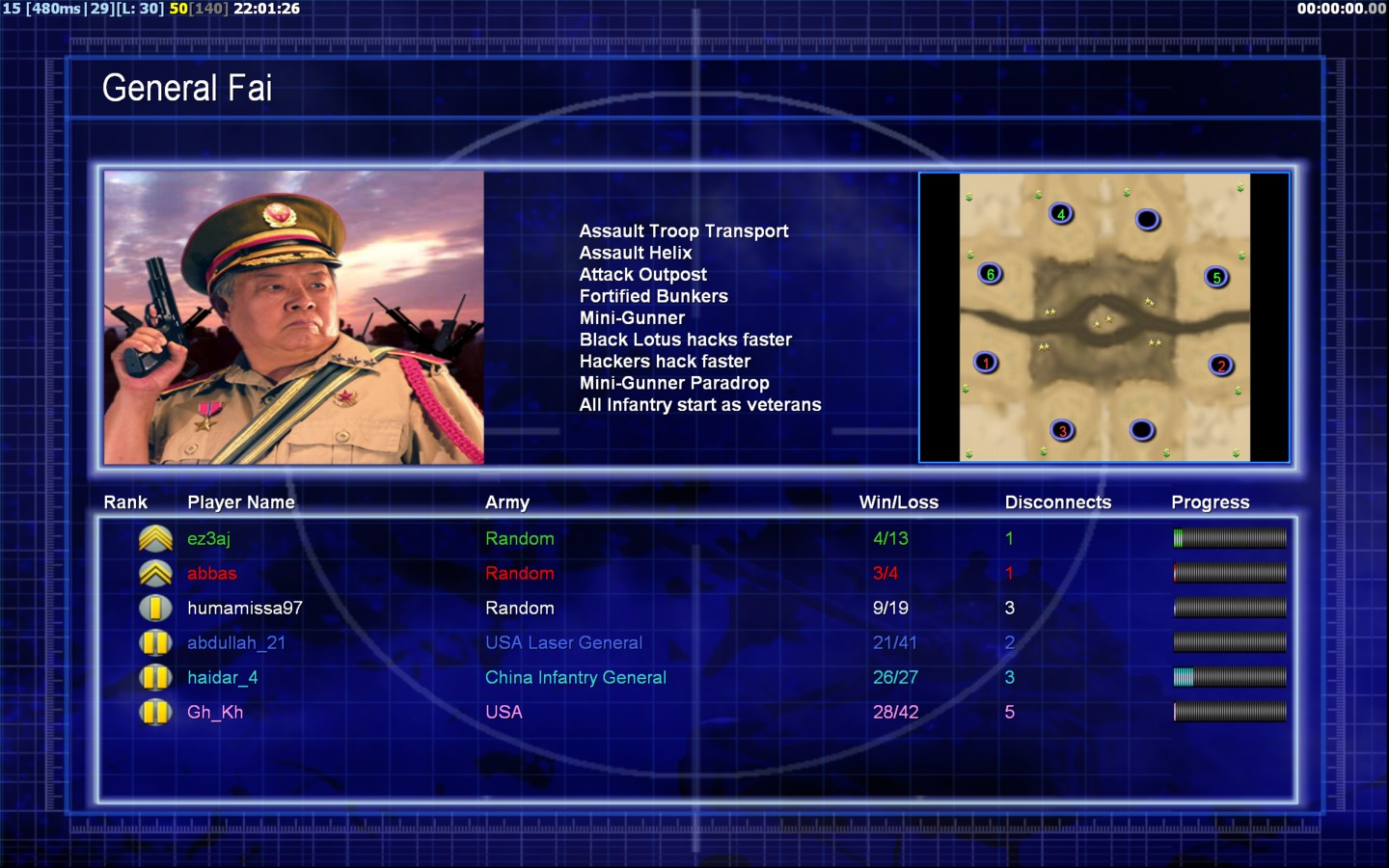 | Nameabdullah_21 | Side | Color | Team1 | Starting Position1 | Buildings Built5 | Buildings Lost0 | Buildings Destroyed0 | Units Built6 | Units Lost0 | Units Destroyed0 | Money Earned0 | OutcomeWon |