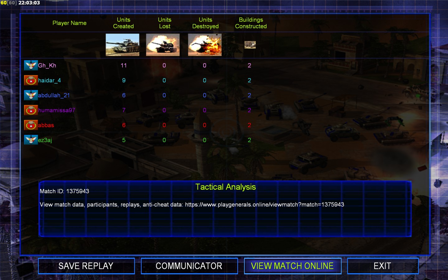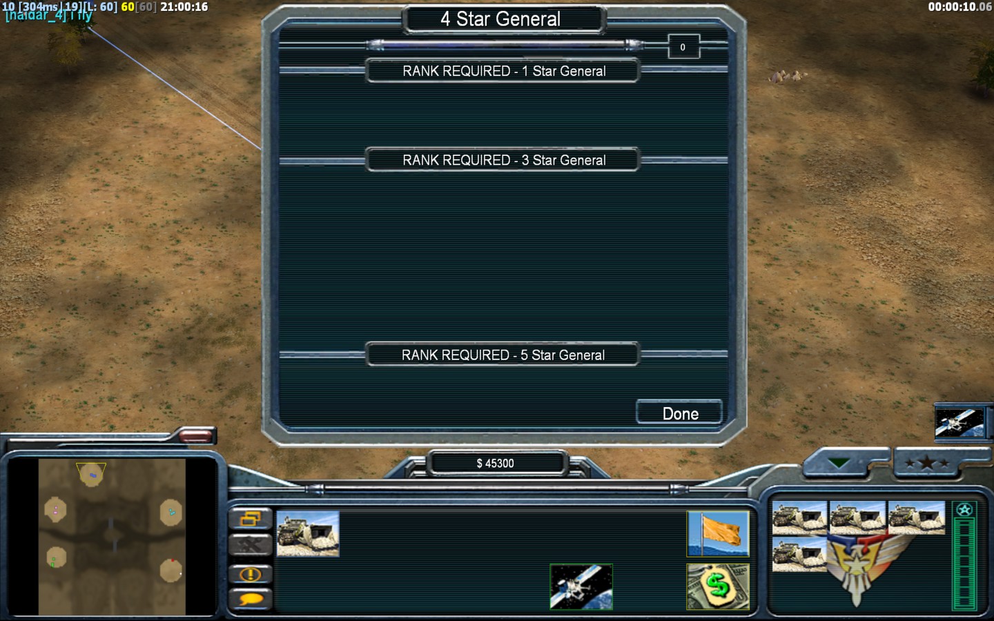 | Nameez3aj | Side | Color | Team0 | Starting Position7 | Buildings Built3 | Buildings Lost0 | Buildings Destroyed0 | Units Built4 | Units Lost0 | Units Destroyed0 | Money Earned0 | OutcomeLost |