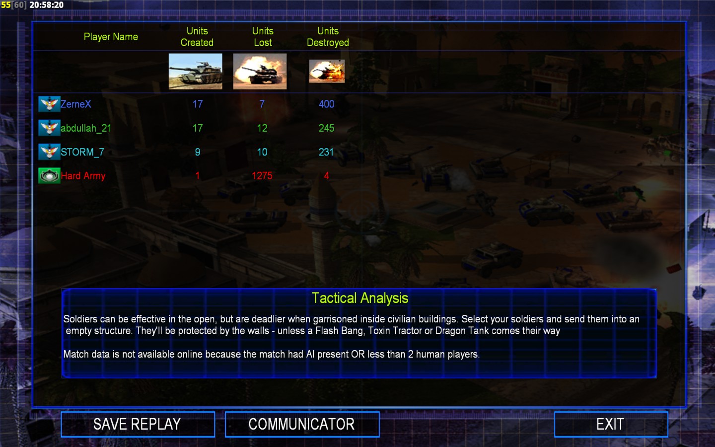 | Name | Side | Color | Team | Starting Position | Buildings Built | Buildings Lost | Buildings Destroyed | Units Built | Units Lost | Units Destroyed | Money Earned | Outcome |