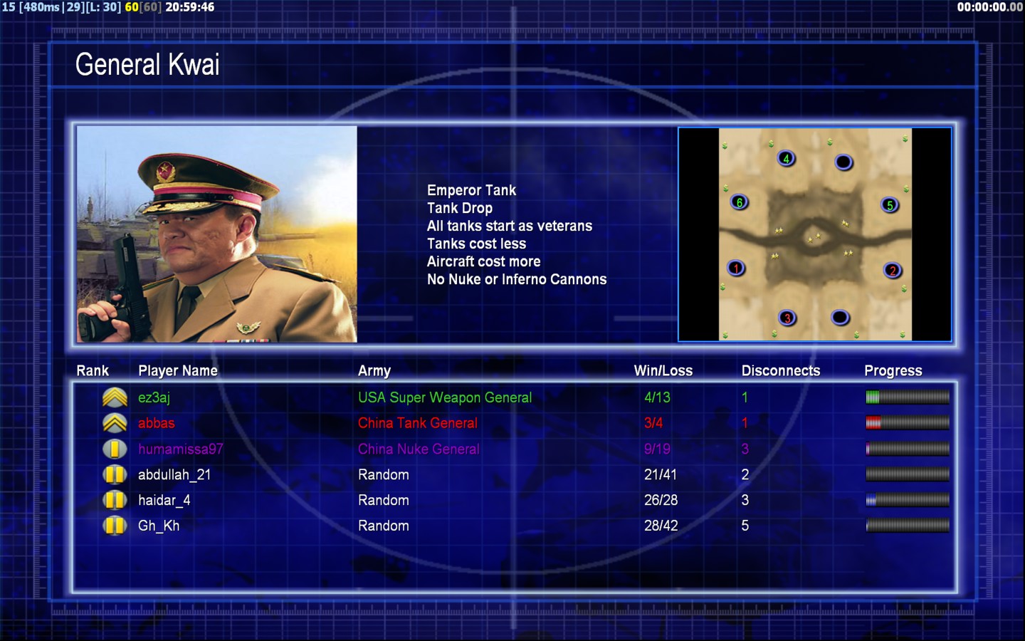 | Nameabbas | Side | Color | Team0 | Starting Position4 | Buildings Built4 | Buildings Lost0 | Buildings Destroyed0 | Units Built6 | Units Lost0 | Units Destroyed0 | Money Earned0 | OutcomeLost |