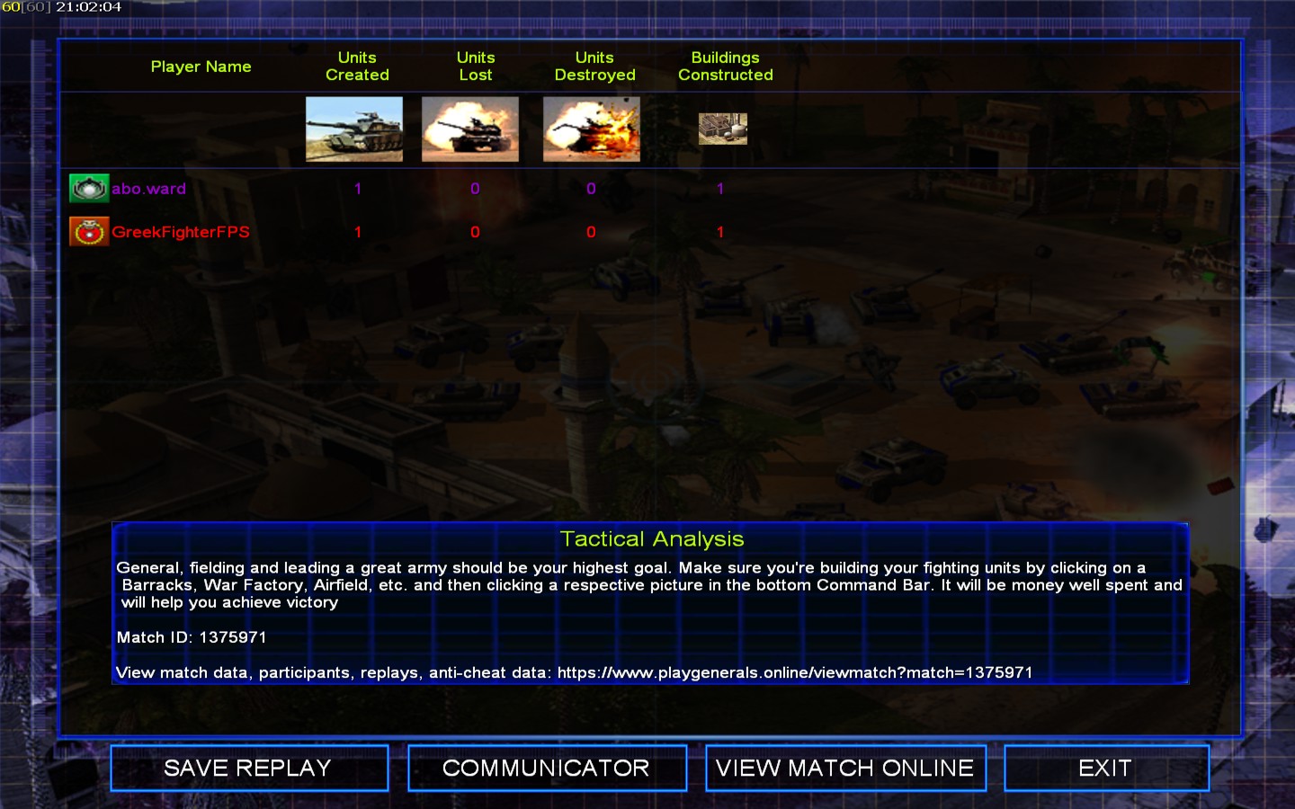 Color | TeamNone | Starting PositionNone | Buildings Built1 | Buildings Lost0 | Buildings Destroyed0 | Units Built1 | Units Lost0 | Units Destroyed0 | Money Earned0 | OutcomeLost |