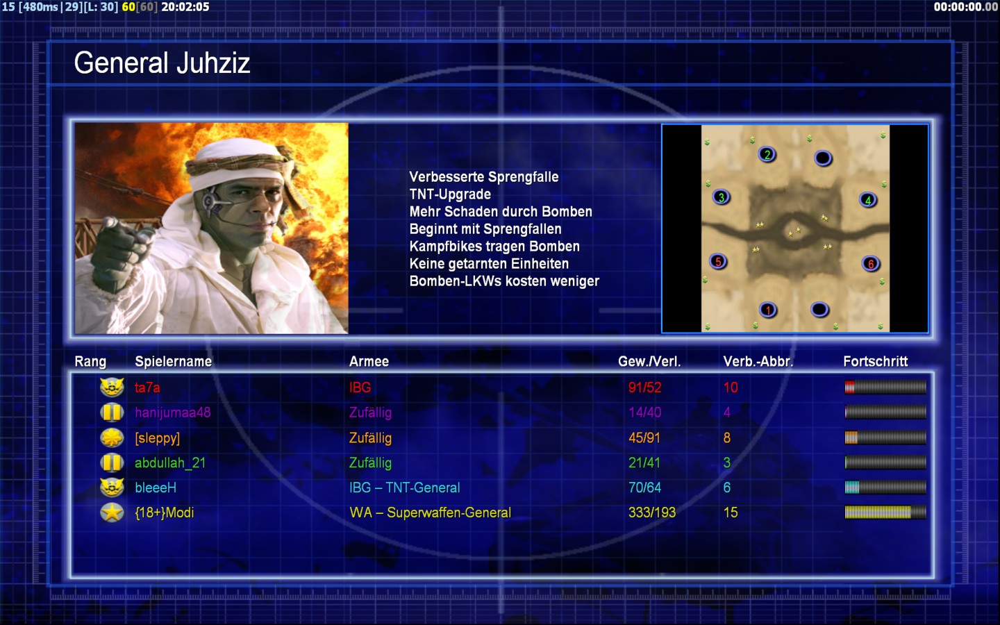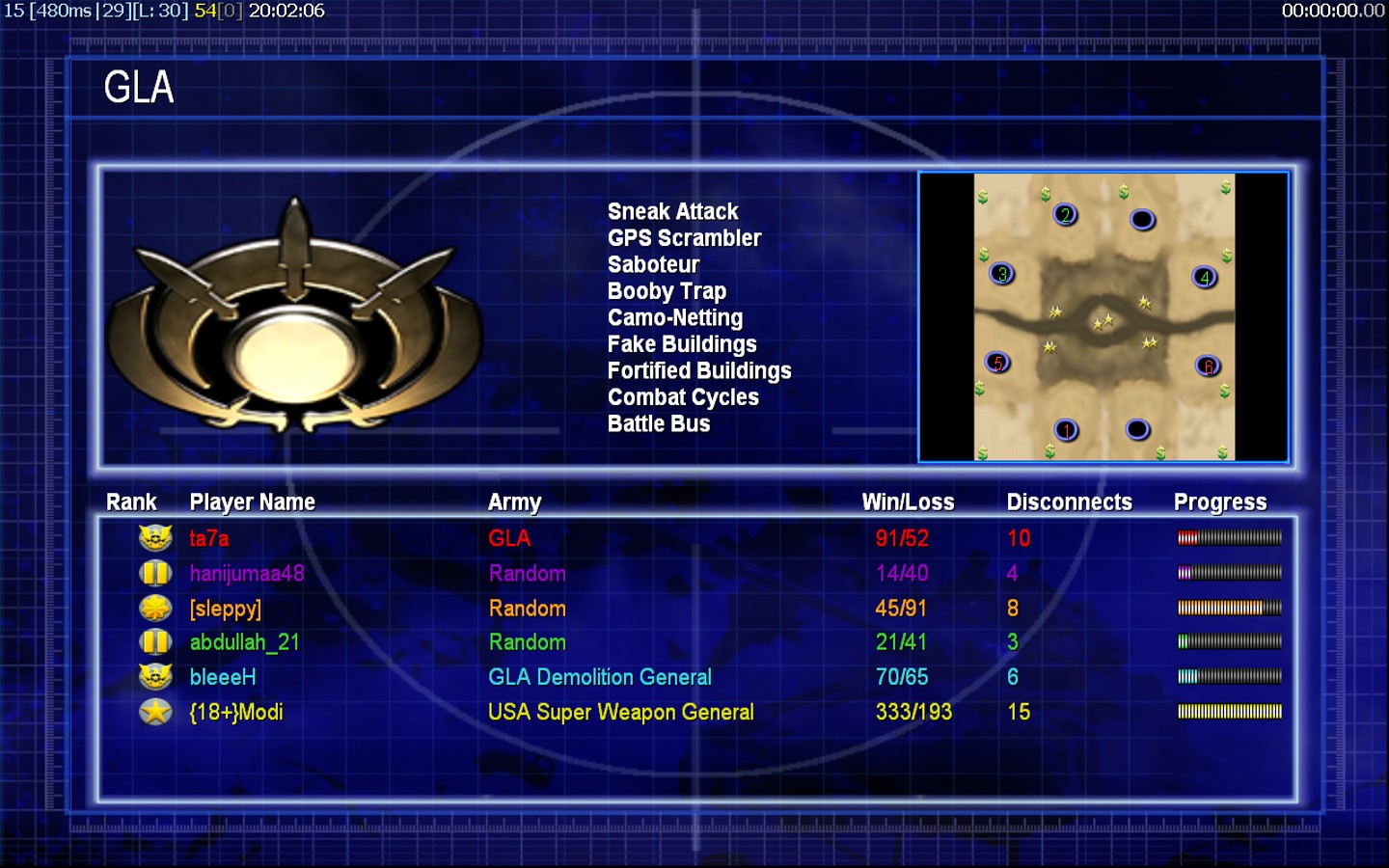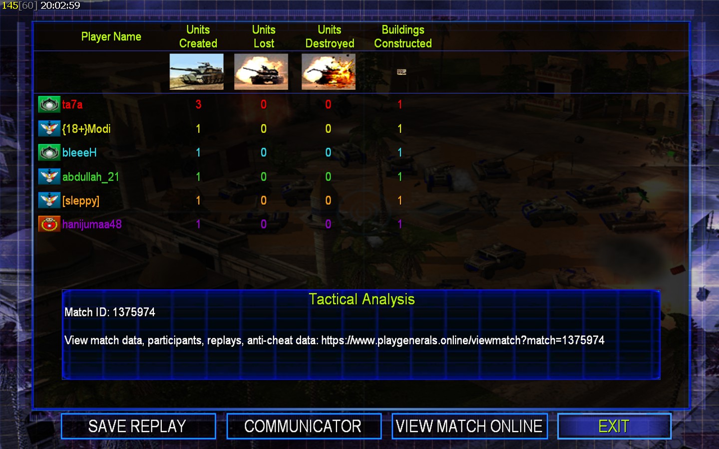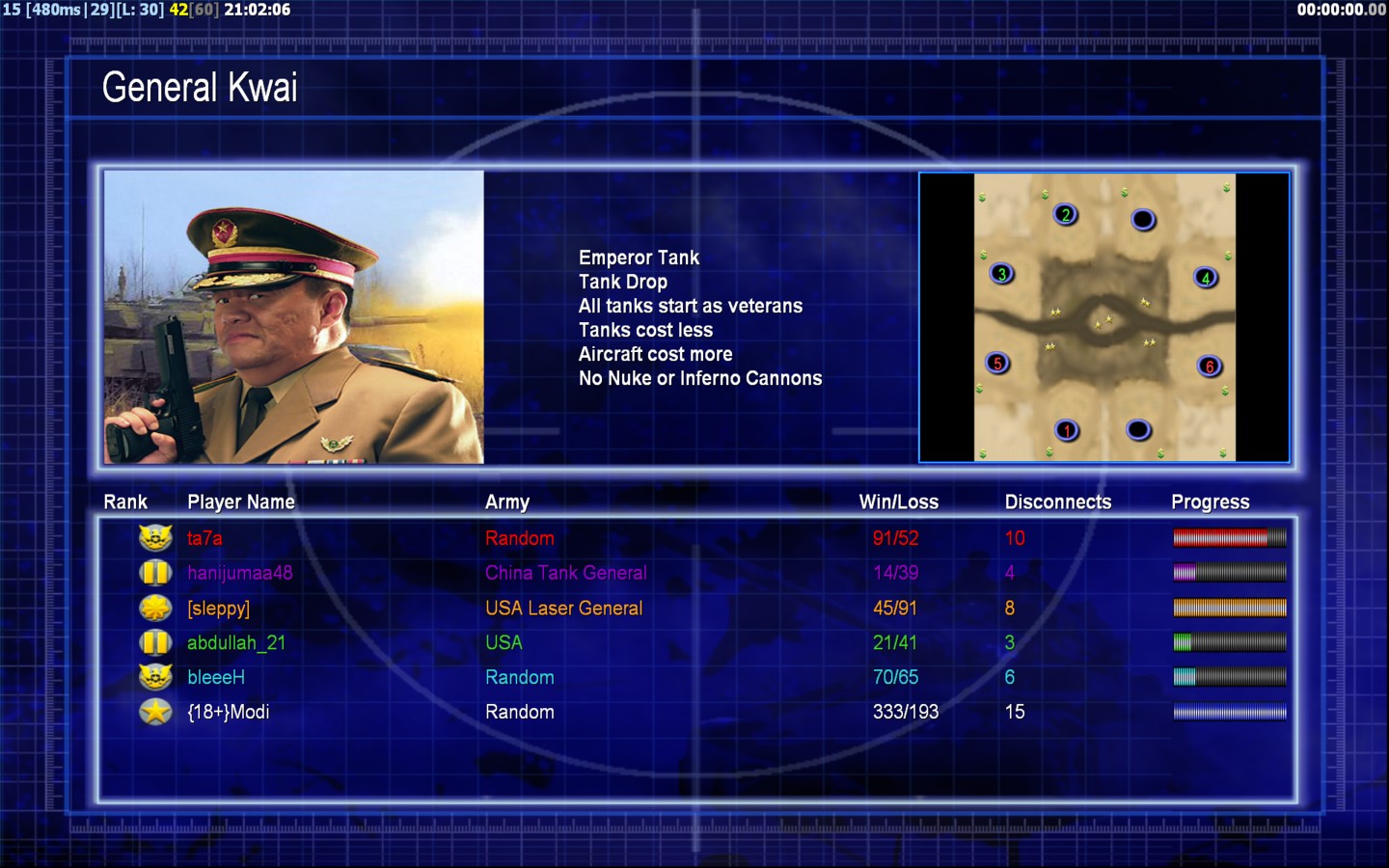 | Namehanijumaa48 | Side | Color | Team1 | Starting Position1 | Buildings Built1 | Buildings Lost0 | Buildings Destroyed0 | Units Built1 | Units Lost0 | Units Destroyed0 | Money Earned0 | OutcomeLost |