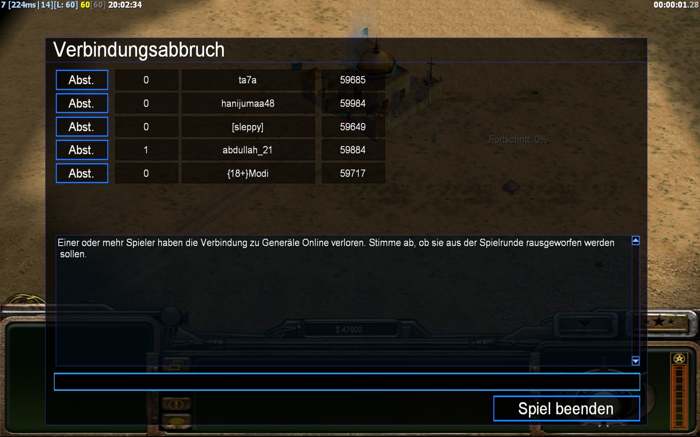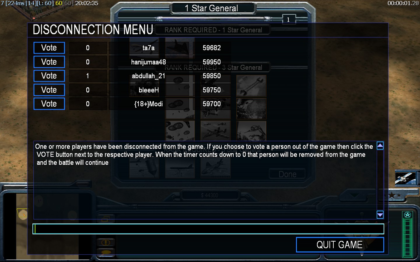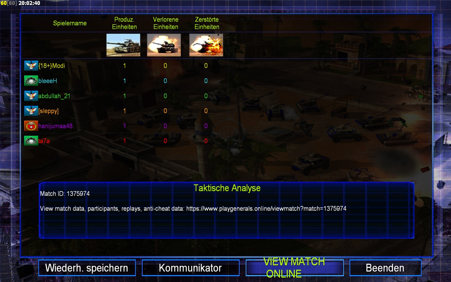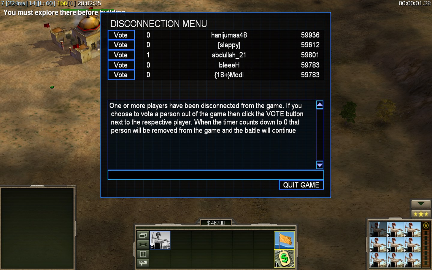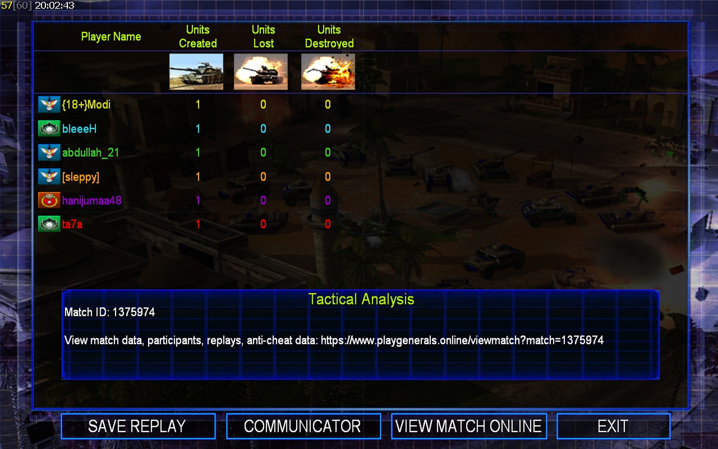 | Namehanijumaa48 | Side | Color | Team1 | Starting Position1 | Buildings Built1 | Buildings Lost0 | Buildings Destroyed0 | Units Built1 | Units Lost0 | Units Destroyed0 | Money Earned0 | OutcomeLost |