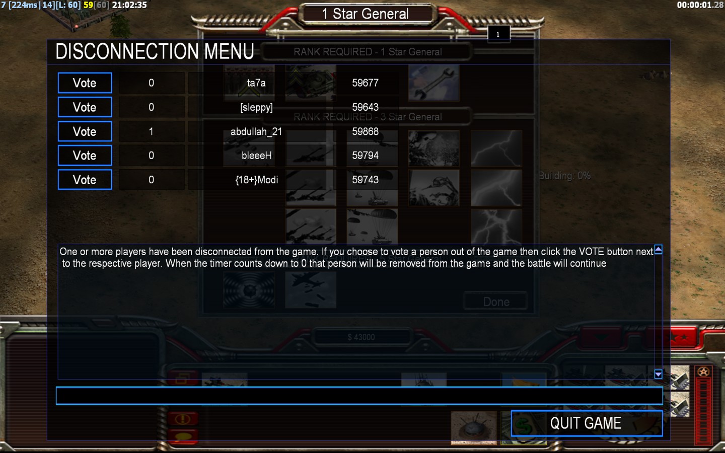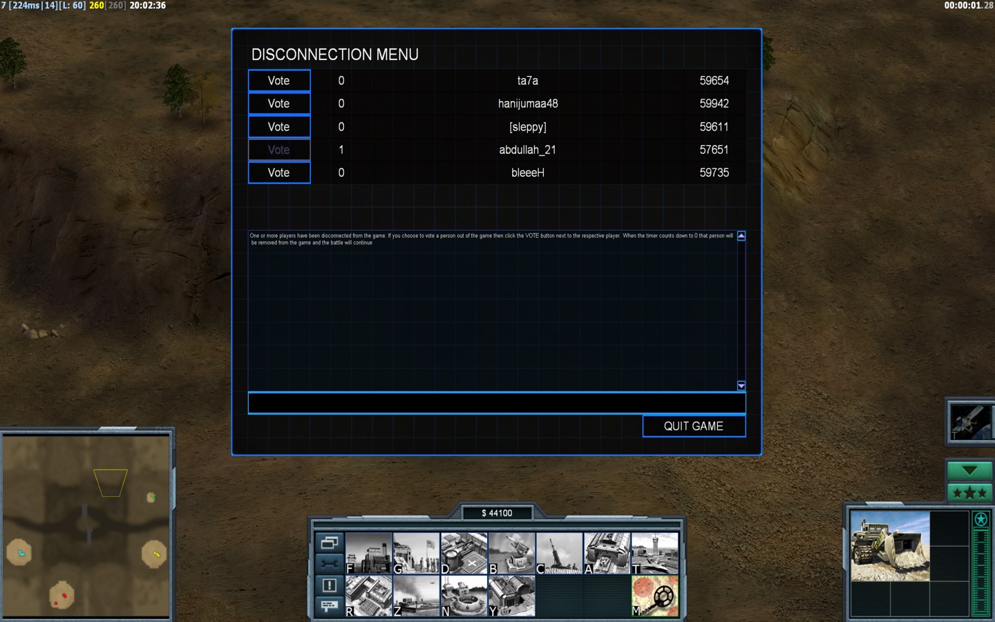 | Name[sleppy] | Side | Color | Team1 | Starting Position0 | Buildings Built1 | Buildings Lost0 | Buildings Destroyed0 | Units Built1 | Units Lost0 | Units Destroyed0 | Money Earned0 | OutcomeLost |