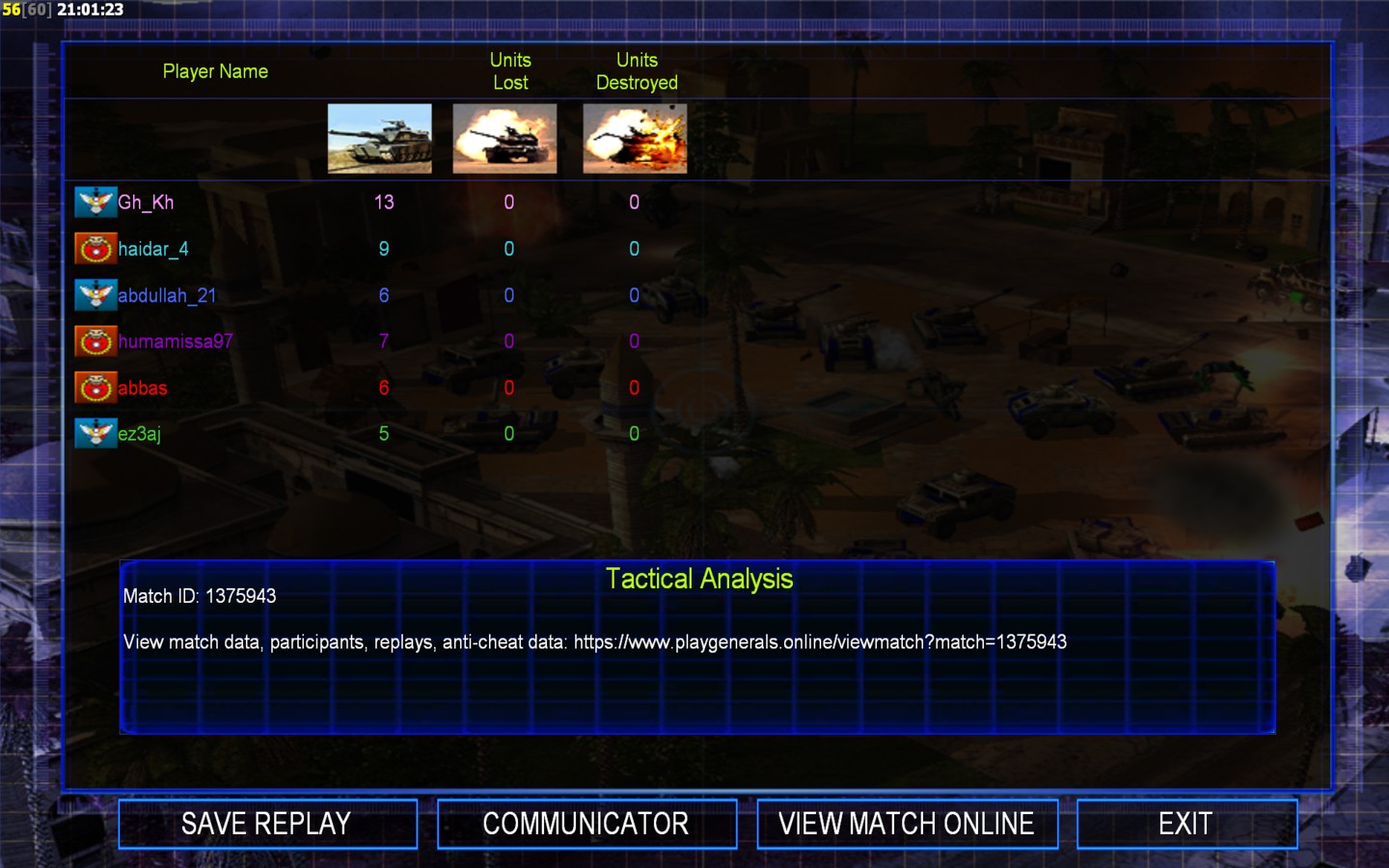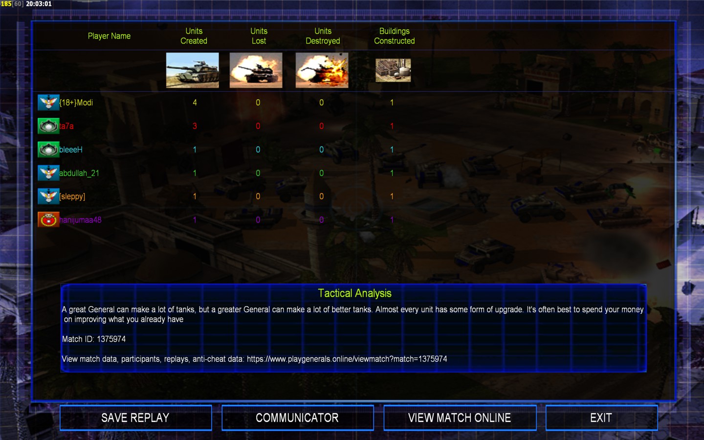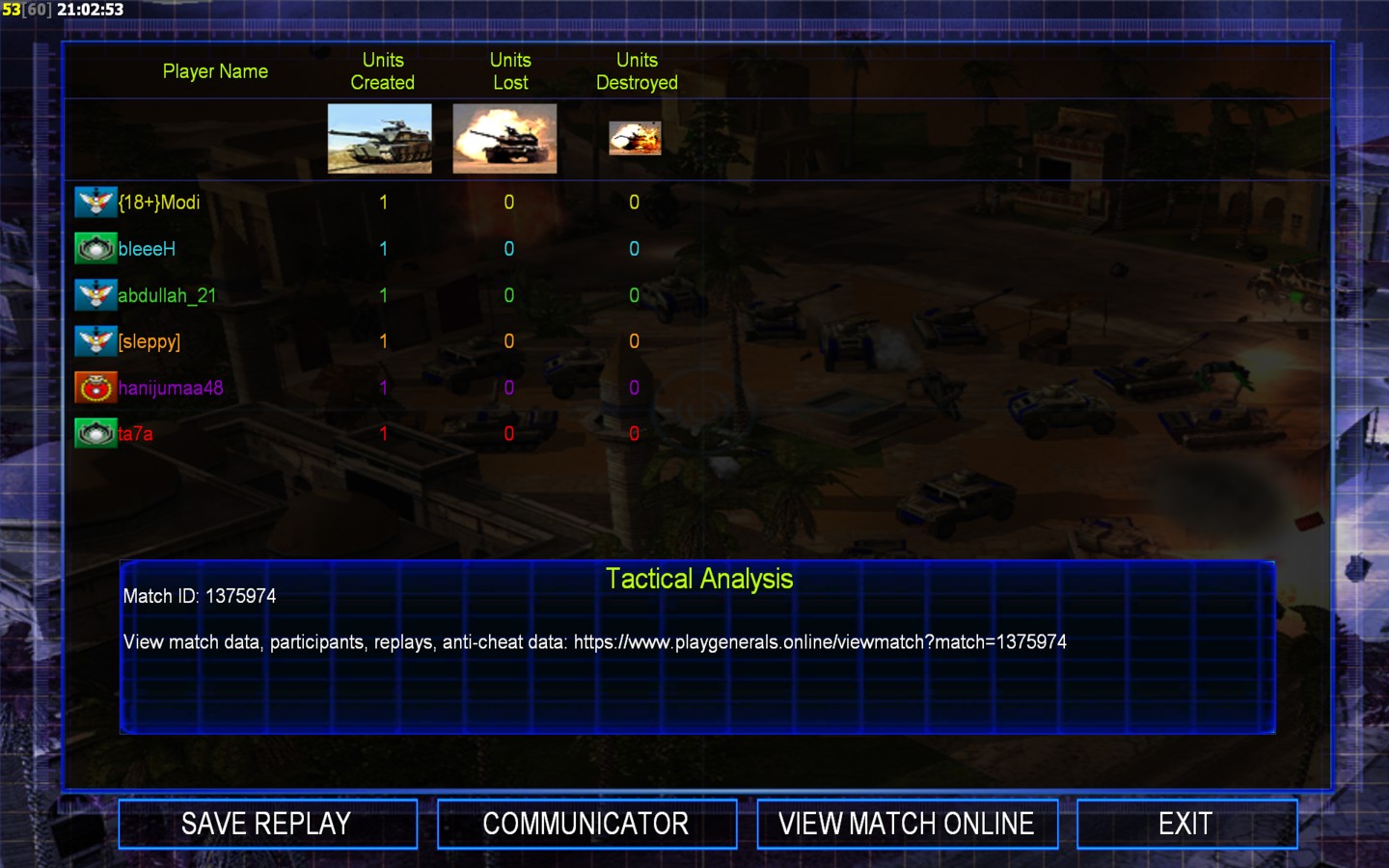 | Nameabdullah_21 | Side | Color | Team1 | Starting Position3 | Buildings Built1 | Buildings Lost0 | Buildings Destroyed0 | Units Built1 | Units Lost0 | Units Destroyed0 | Money Earned0 | OutcomeWon |