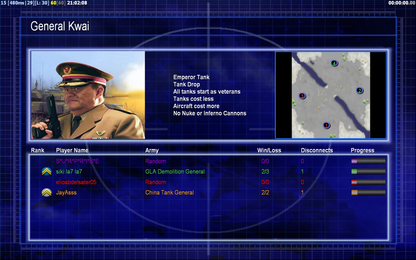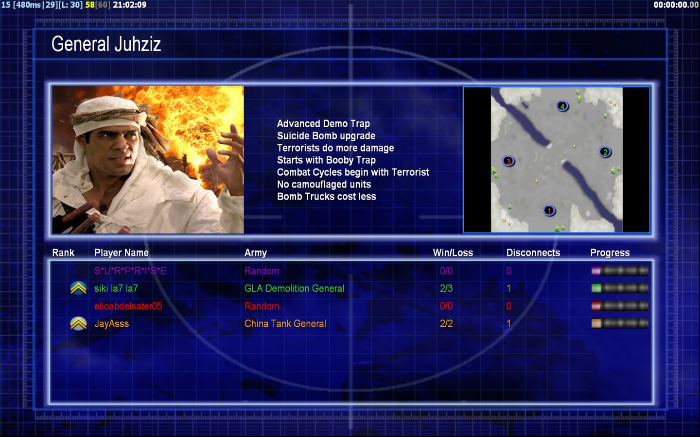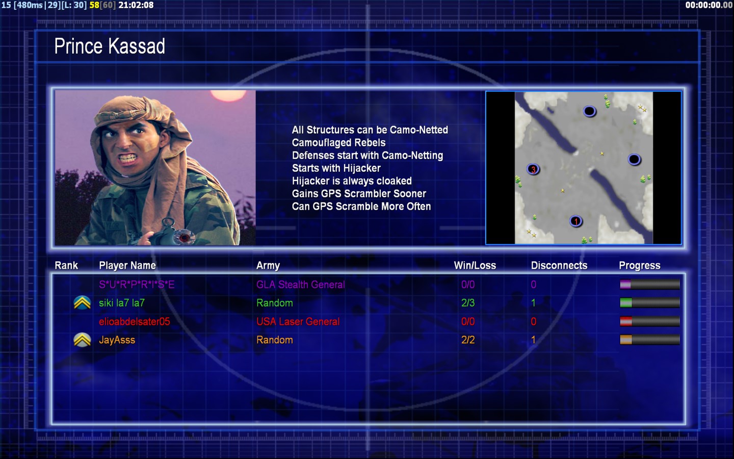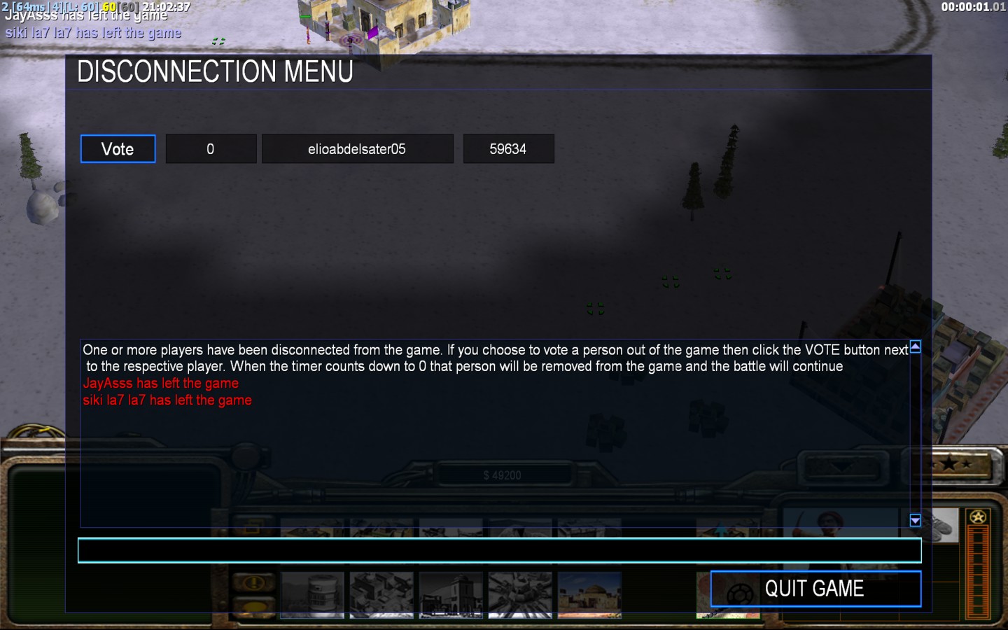 | Namesiki la7 la7 | Side | Color | Team1 | Starting PositionNone | Buildings Built1 | Buildings Lost0 | Buildings Destroyed0 | Units Built1 | Units Lost0 | Units Destroyed0 | Money Earned0 | OutcomeLost |