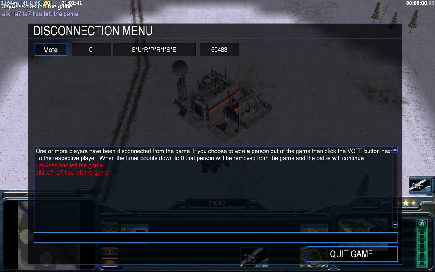 | NameS*U*R*P*R*I*S*E | Side | Color | Team0 | Starting Position1 | Buildings Built1 | Buildings Lost0 | Buildings Destroyed0 | Units Built1 | Units Lost0 | Units Destroyed0 | Money Earned0 | OutcomeWon |