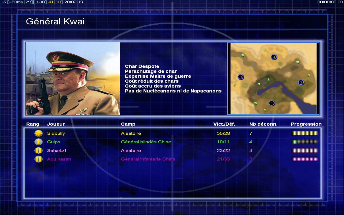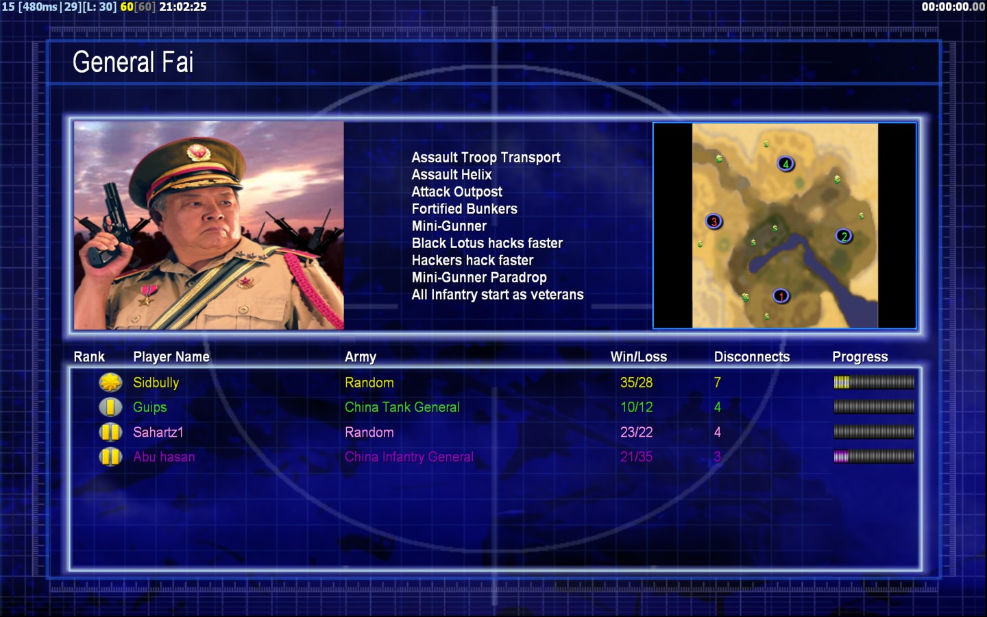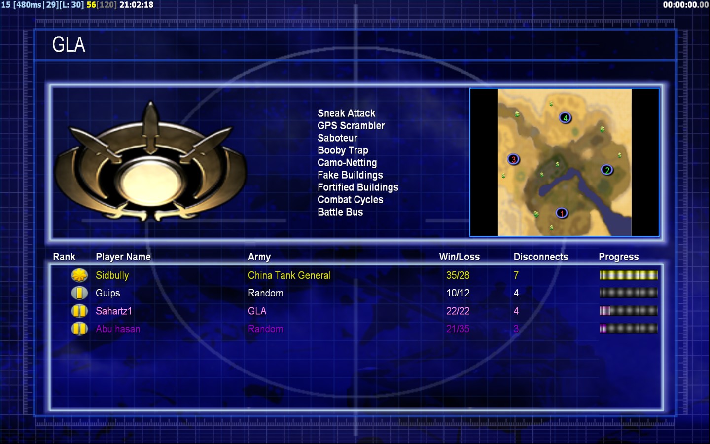 | NameAbu hasan | Side | Color | Team1 | Starting Position2 | Buildings Built7 | Buildings Lost5 | Buildings Destroyed0 | Units Built20 | Units Lost23 | Units Destroyed17 | Money Earned12300 | OutcomeLost |