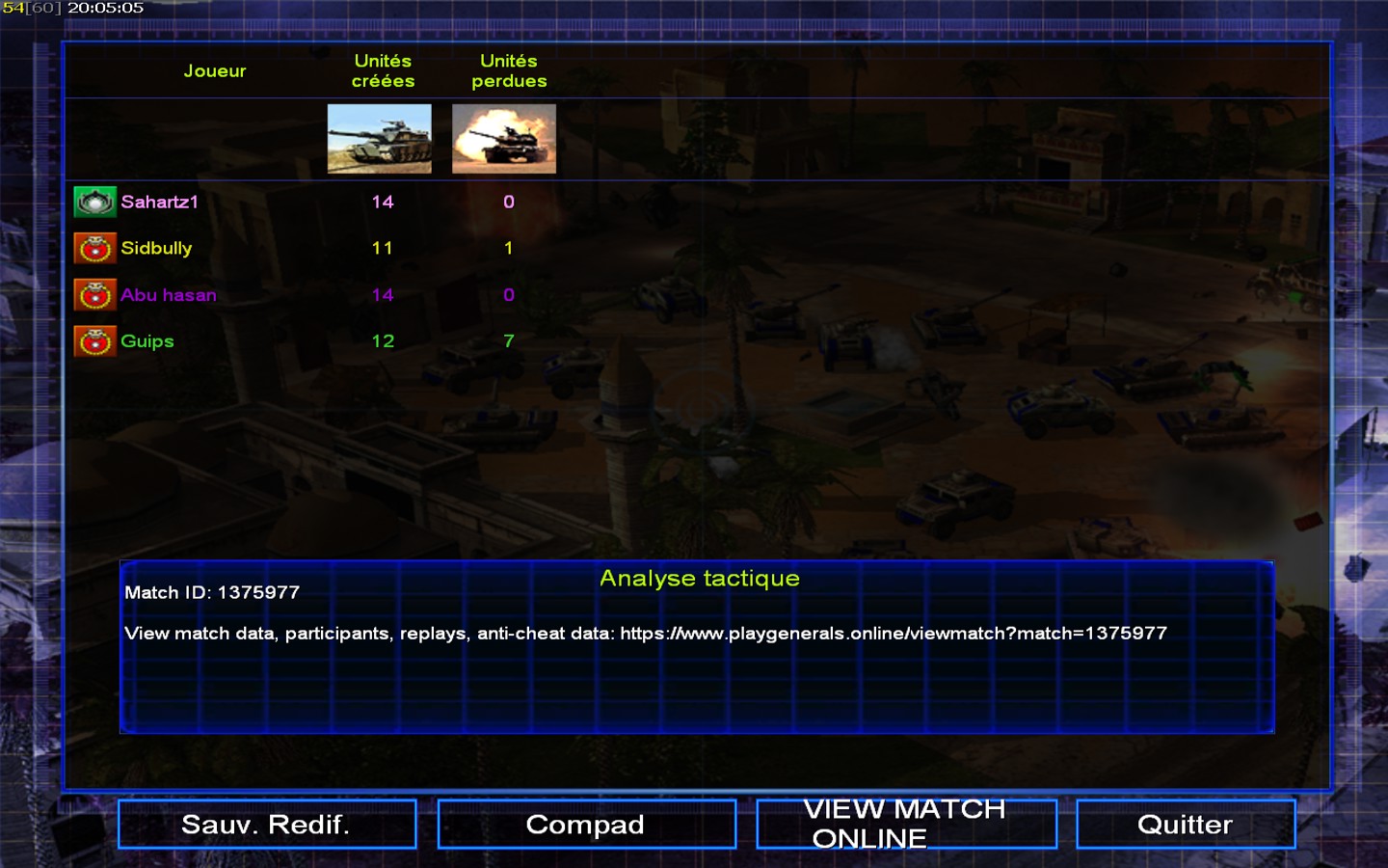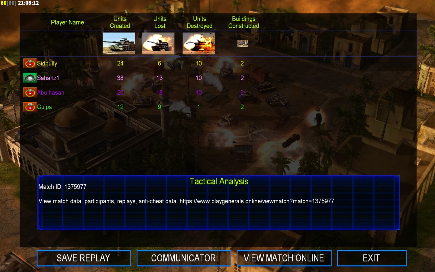 | Name | Side | Color | Team | Starting Position | Buildings Built | Buildings Lost | Buildings Destroyed | Units Built | Units Lost | Units Destroyed | Money Earned | Outcome |