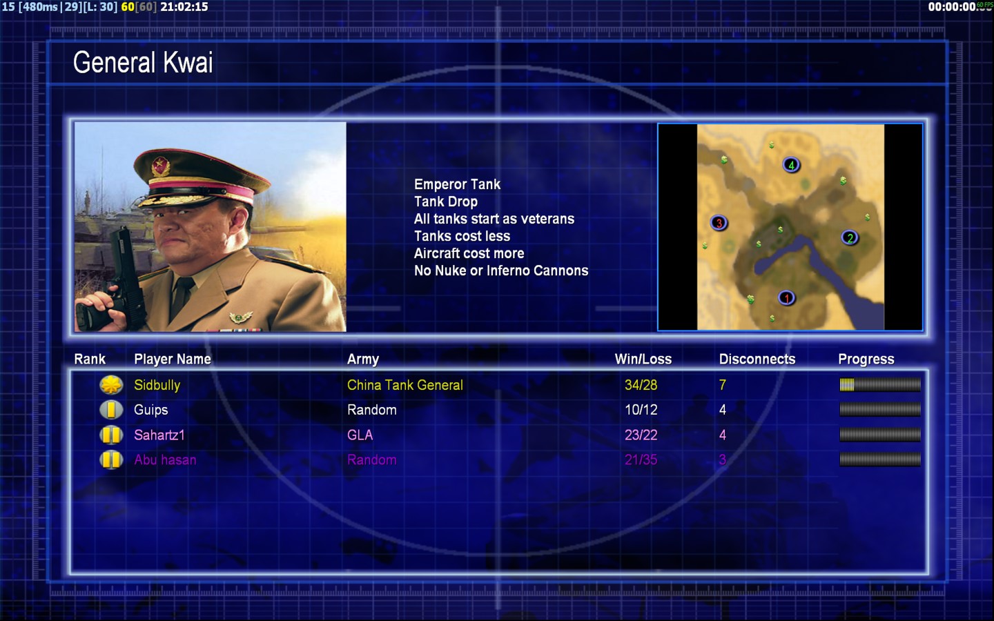 | NameGuips | Side | Color | Team1 | Starting Position3 | Buildings Built5 | Buildings Lost5 | Buildings Destroyed0 | Units Built12 | Units Lost9 | Units Destroyed1 | Money Earned2400 | OutcomeLost |