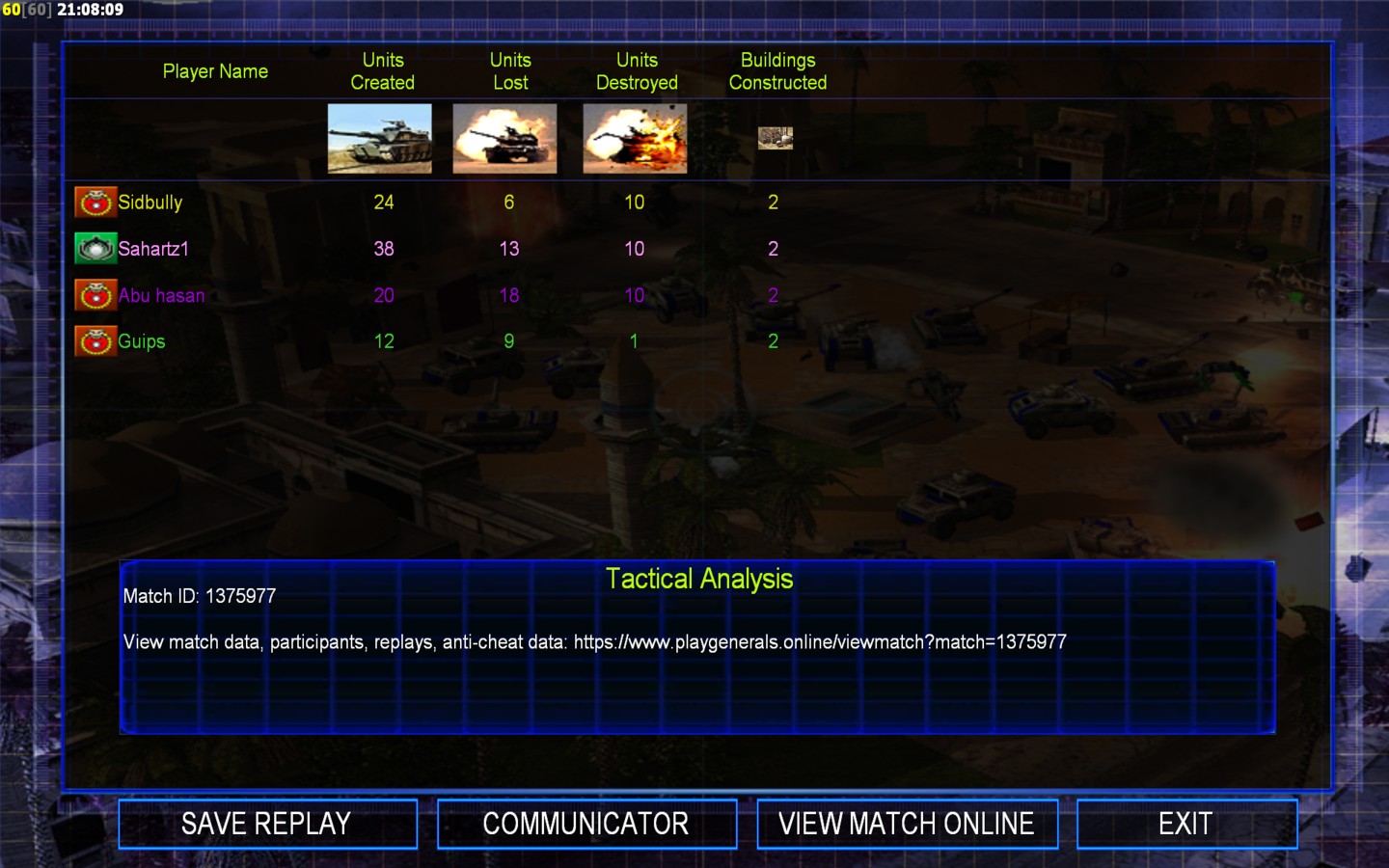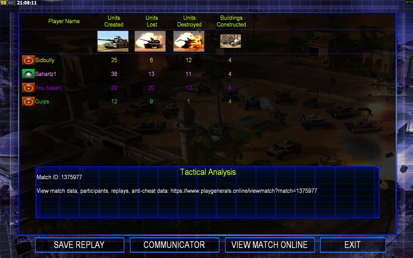 | NameSidbully | Side | Color | Team0 | Starting Position0 | Buildings Built6 | Buildings Lost0 | Buildings Destroyed7 | Units Built23 | Units Lost6 | Units Destroyed20 | Money Earned16500 | OutcomeWon |