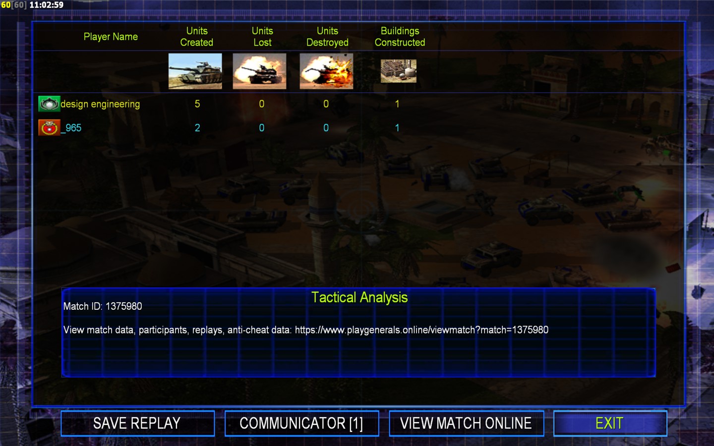 | Name | Side | Color | Team | Starting Position | Buildings Built | Buildings Lost | Buildings Destroyed | Units Built | Units Lost | Units Destroyed | Money Earned | Outcome |