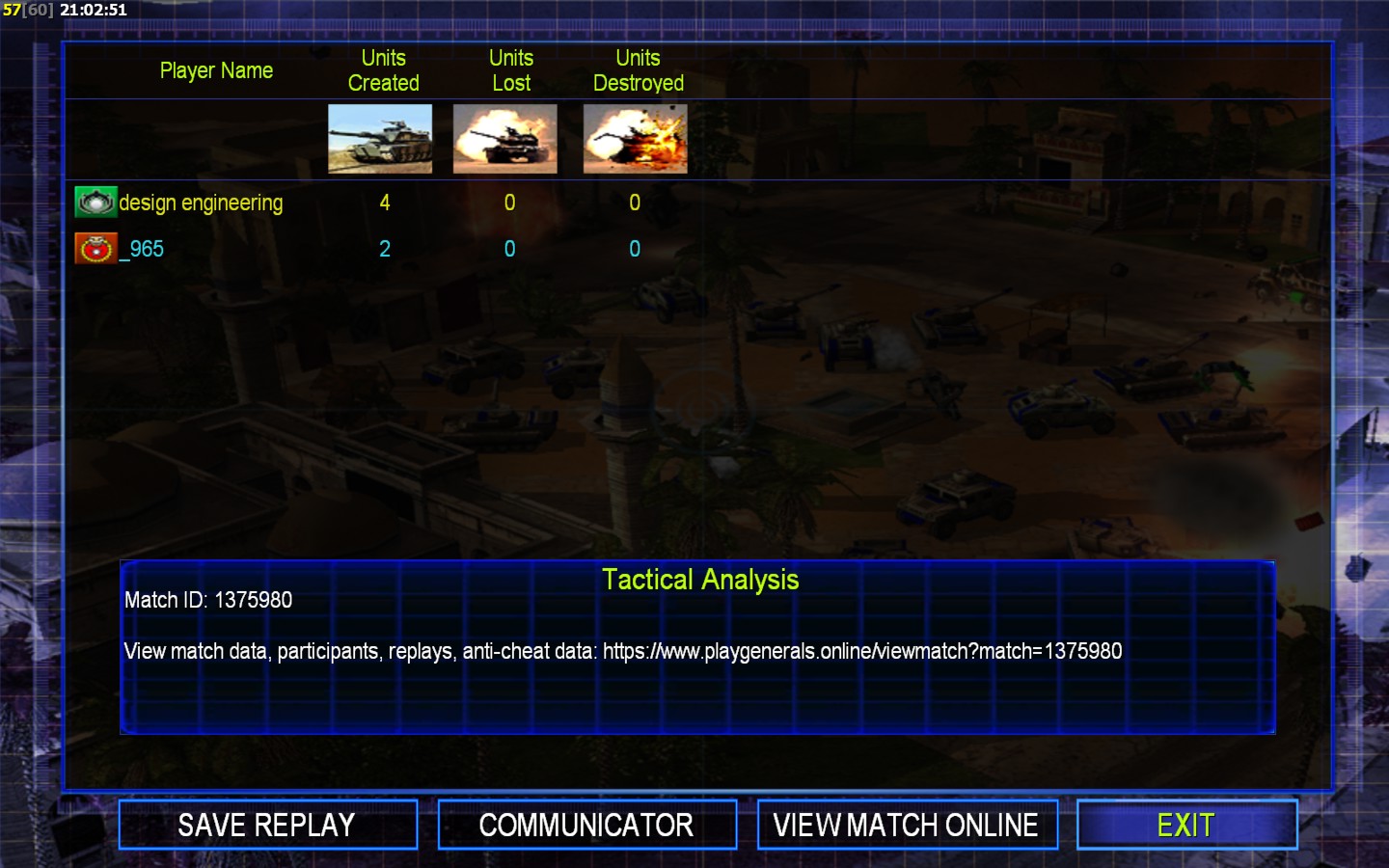 Color | TeamNone | Starting PositionNone | Buildings Built1 | Buildings Lost0 | Buildings Destroyed0 | Units Built2 | Units Lost0 | Units Destroyed0 | Money Earned1000 | OutcomeLost |
