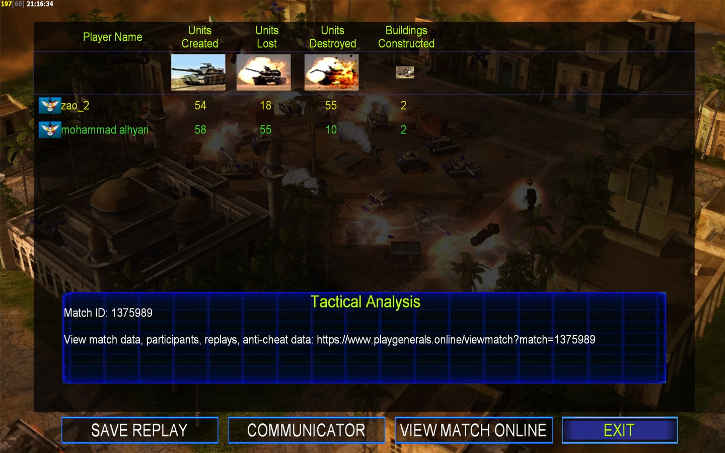 Color | TeamNone | Starting PositionNone | Buildings Built10 | Buildings Lost1 | Buildings Destroyed1 | Units Built58 | Units Lost55 | Units Destroyed29 | Money Earned28950 | OutcomeLost |