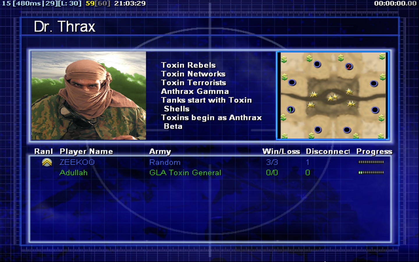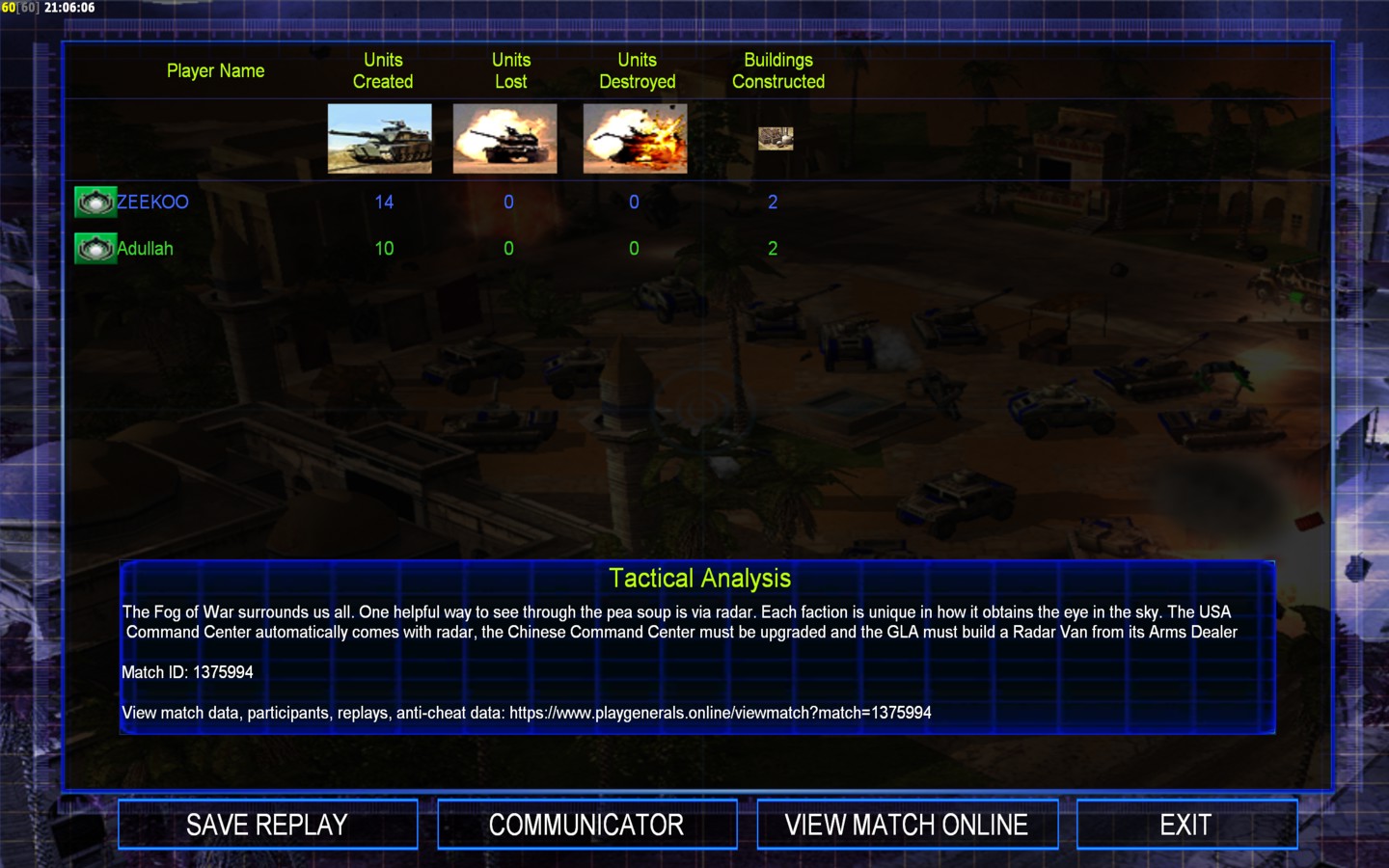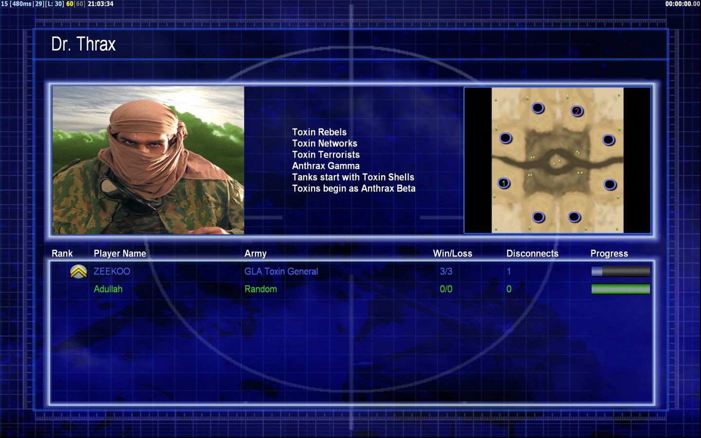 | NameAdullah | Side | Color | Team0 | Starting Position2 | Buildings Built4 | Buildings Lost0 | Buildings Destroyed0 | Units Built9 | Units Lost0 | Units Destroyed0 | Money Earned0 | OutcomeLost |