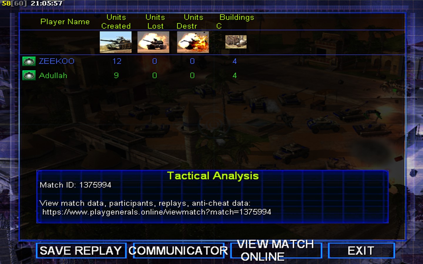 | Name | Side | Color | Team | Starting Position | Buildings Built | Buildings Lost | Buildings Destroyed | Units Built | Units Lost | Units Destroyed | Money Earned | Outcome |
