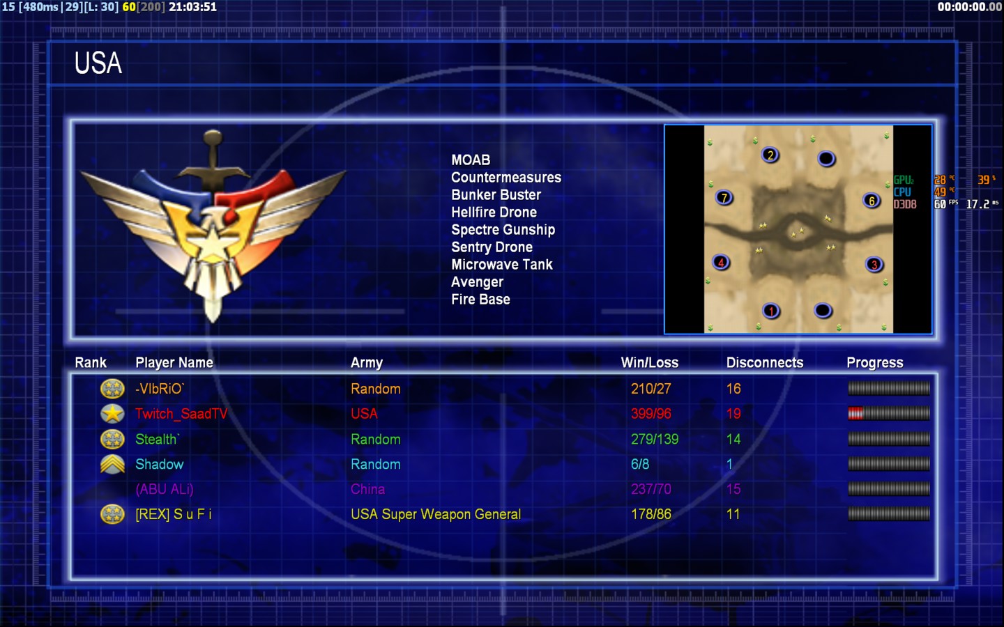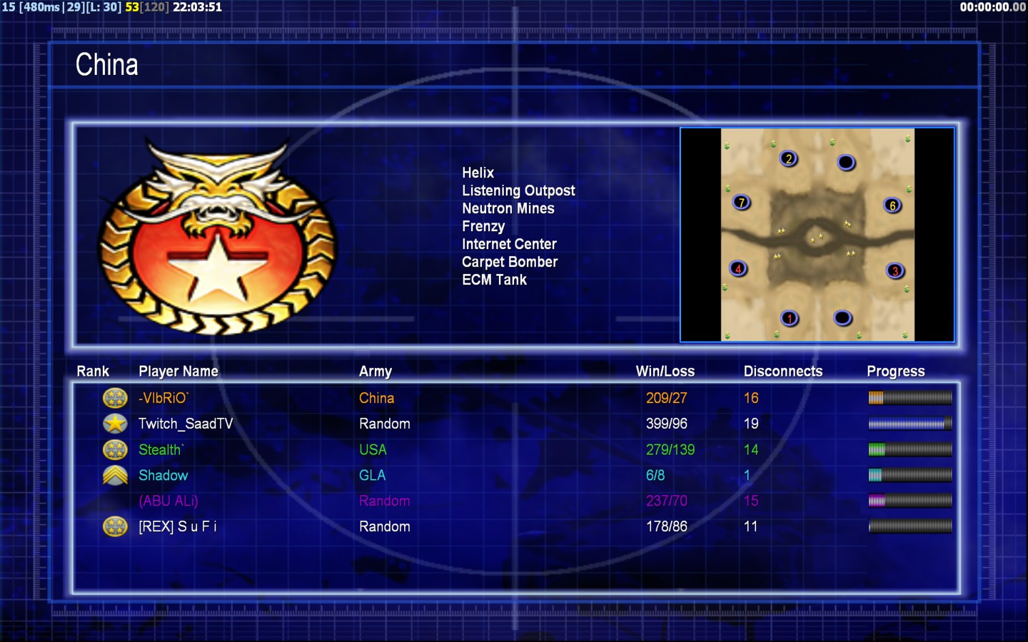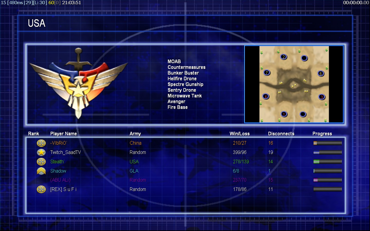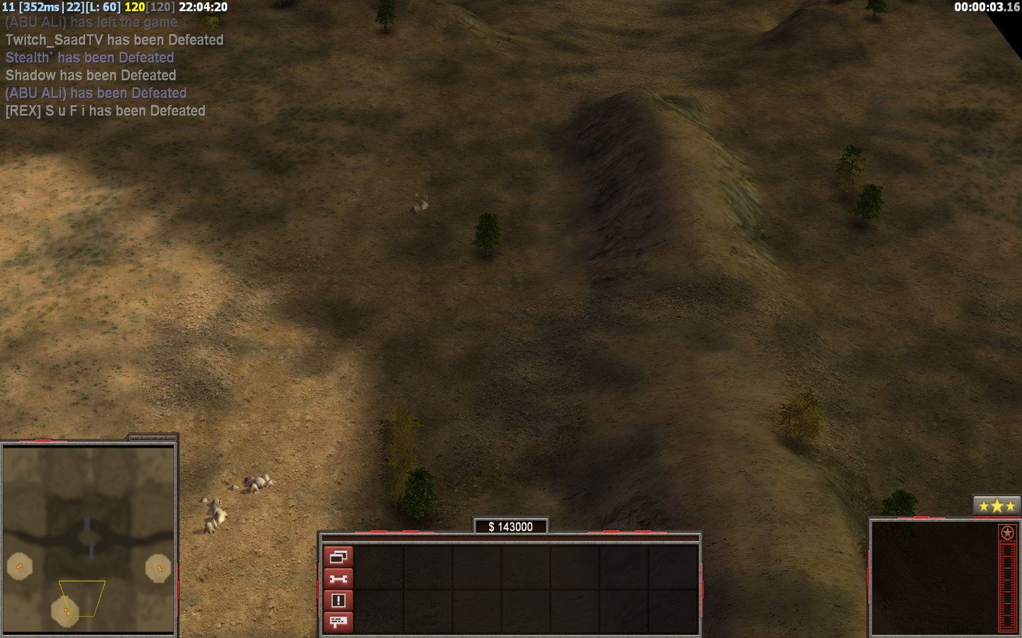 | Name[REX] S u F i | Side | Color | Team3 | Starting Position0 | Buildings Built1 | Buildings Lost0 | Buildings Destroyed0 | Units Built1 | Units Lost0 | Units Destroyed0 | Money Earned0 | OutcomeLost |