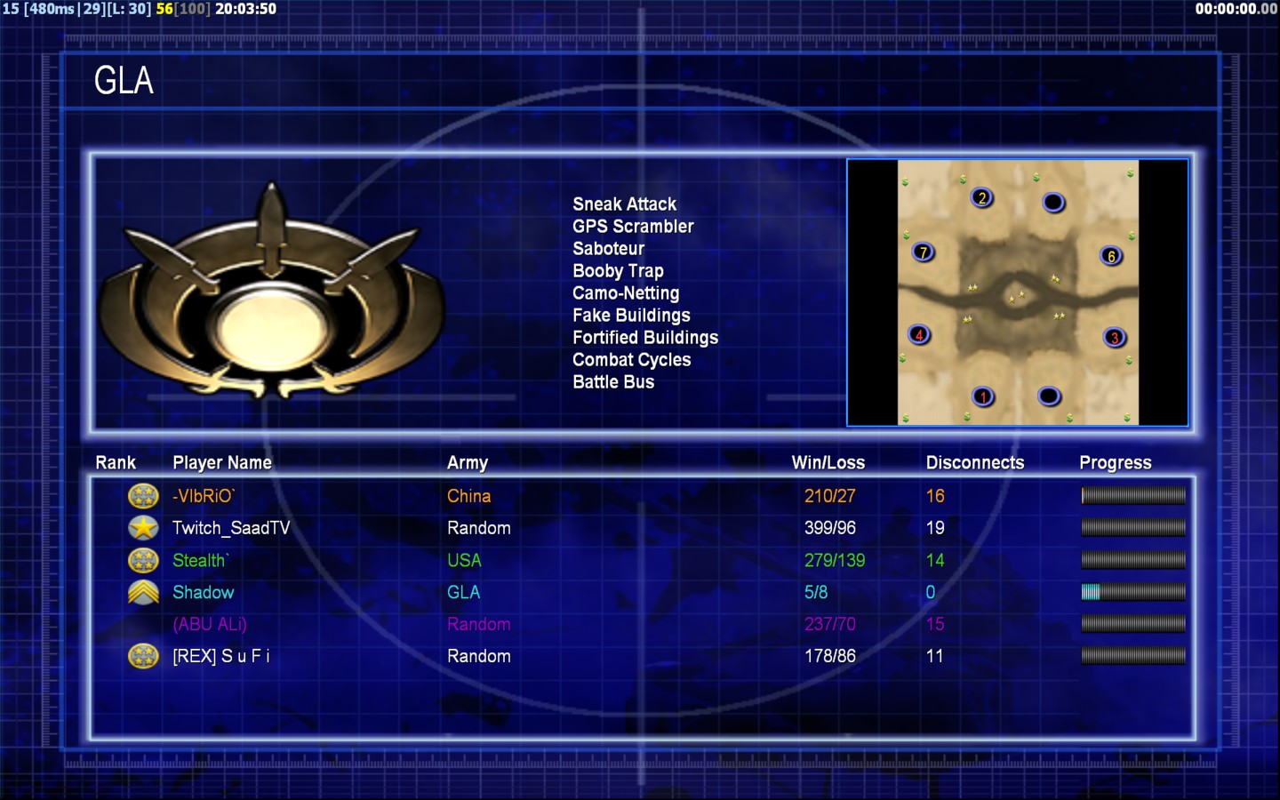 | NameTwitch_SaadTV | Side | Color | Team3 | Starting Position1 | Buildings Built1 | Buildings Lost0 | Buildings Destroyed0 | Units Built1 | Units Lost0 | Units Destroyed0 | Money Earned0 | OutcomeLost |