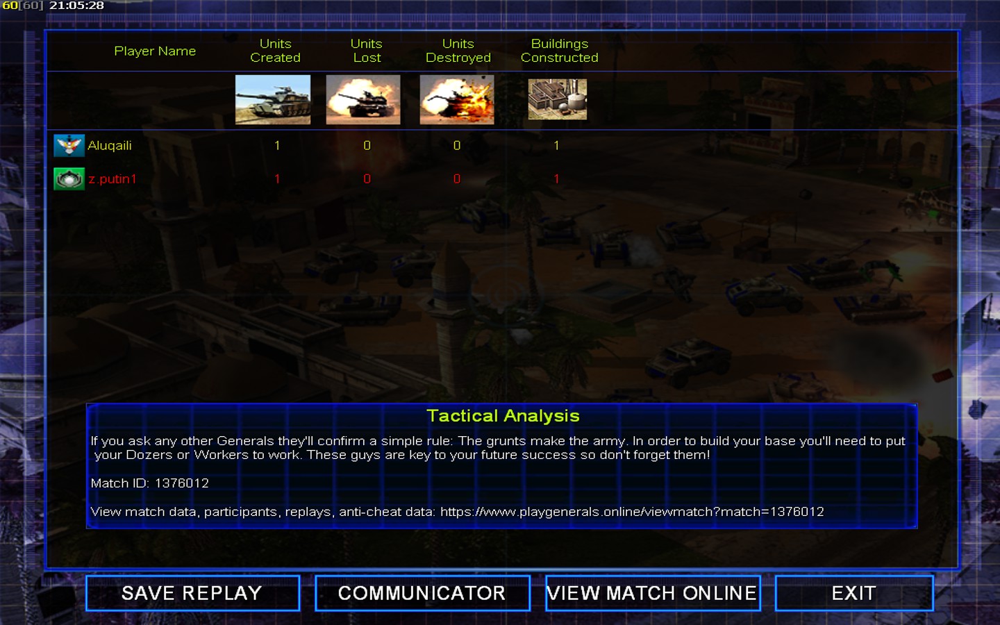Color | TeamNone | Starting PositionNone | Buildings Built1 | Buildings Lost0 | Buildings Destroyed0 | Units Built1 | Units Lost0 | Units Destroyed0 | Money Earned0 | OutcomeWon |