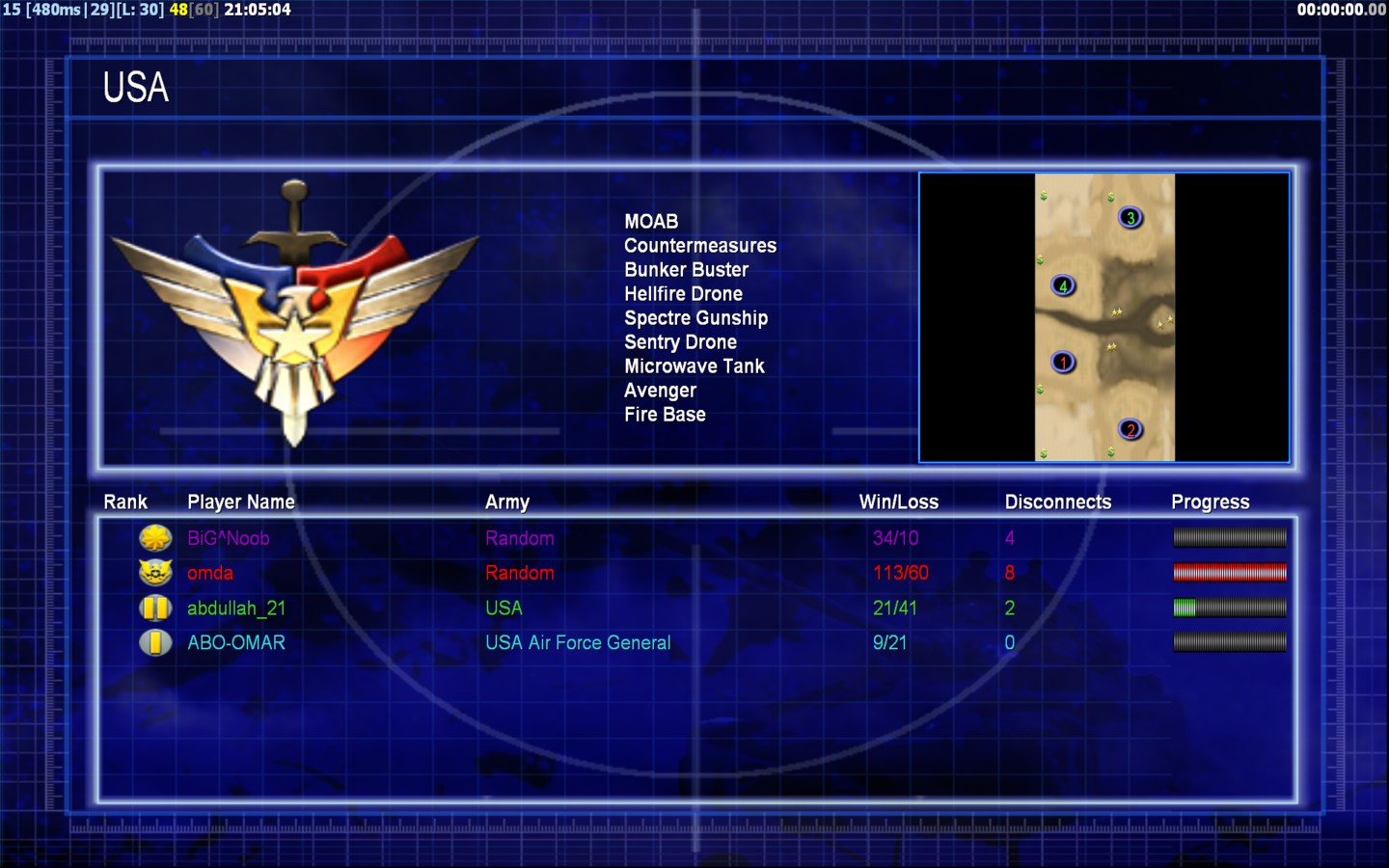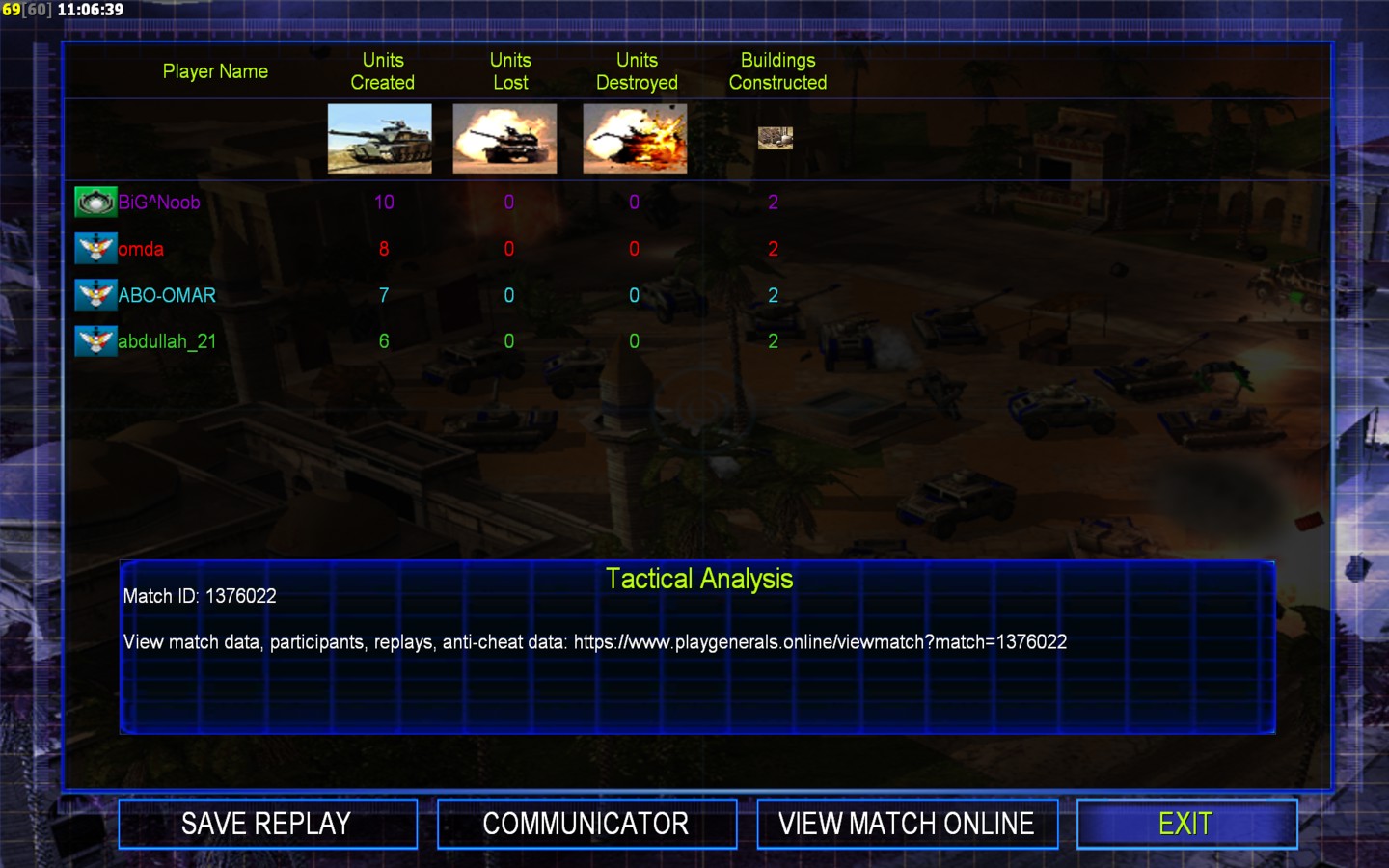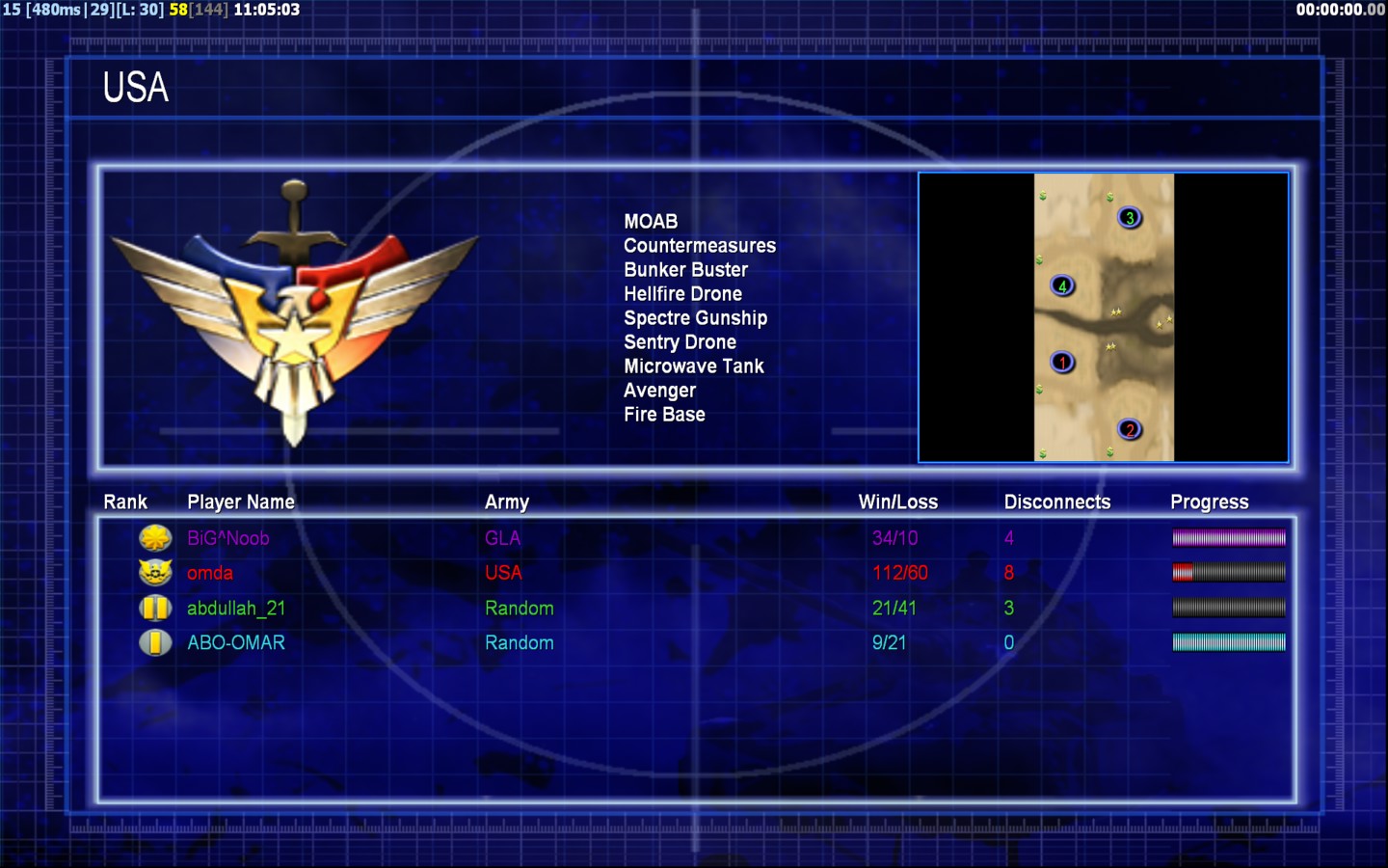 | NameABO-OMAR | Side | Color | Team1 | Starting Position0 | Buildings Built3 | Buildings Lost0 | Buildings Destroyed0 | Units Built8 | Units Lost0 | Units Destroyed0 | Money Earned0 | OutcomeWon |