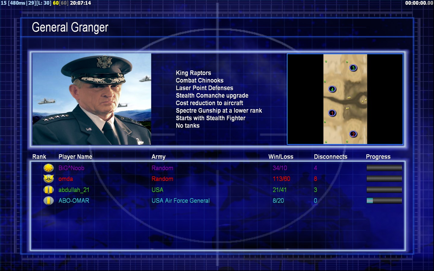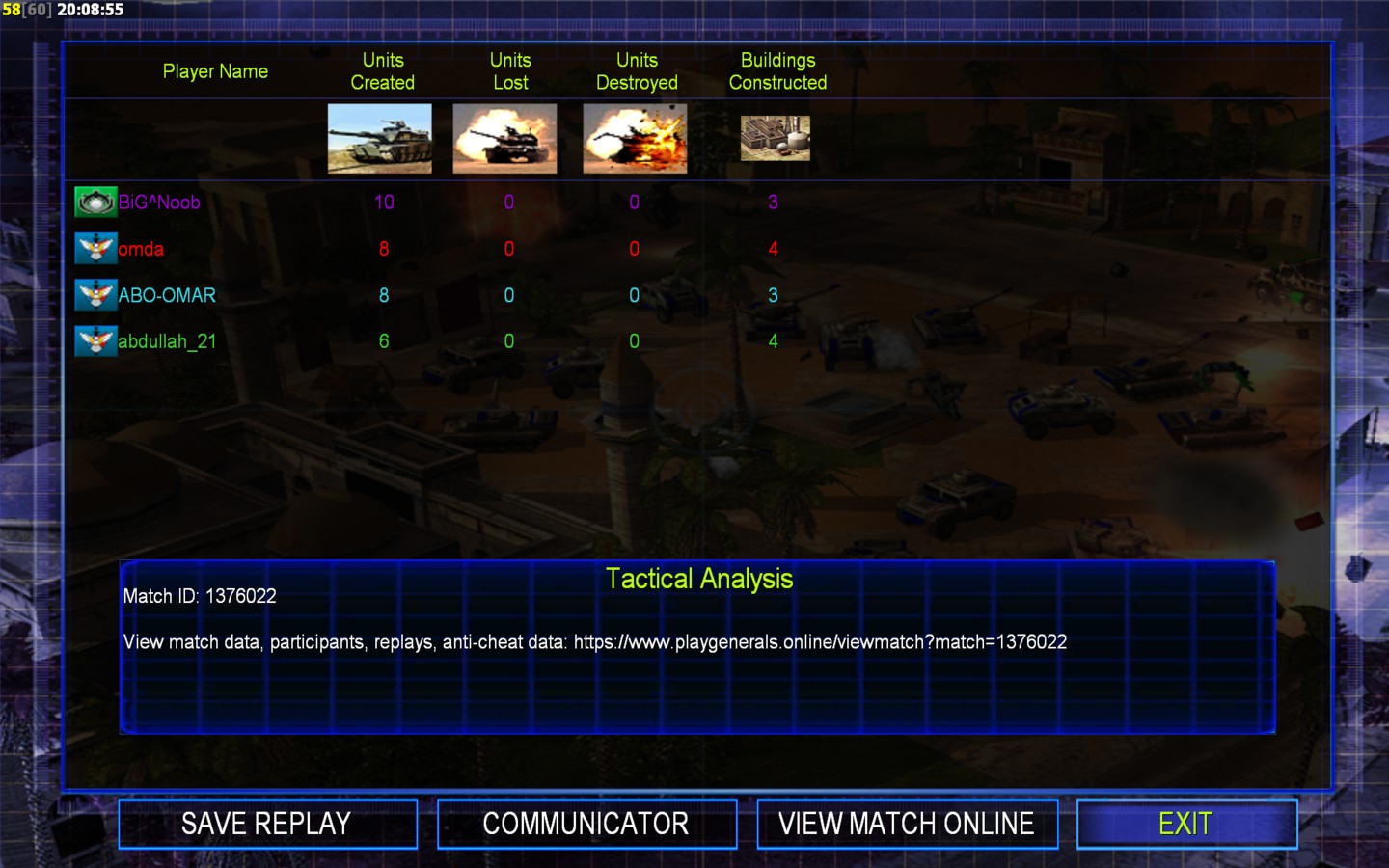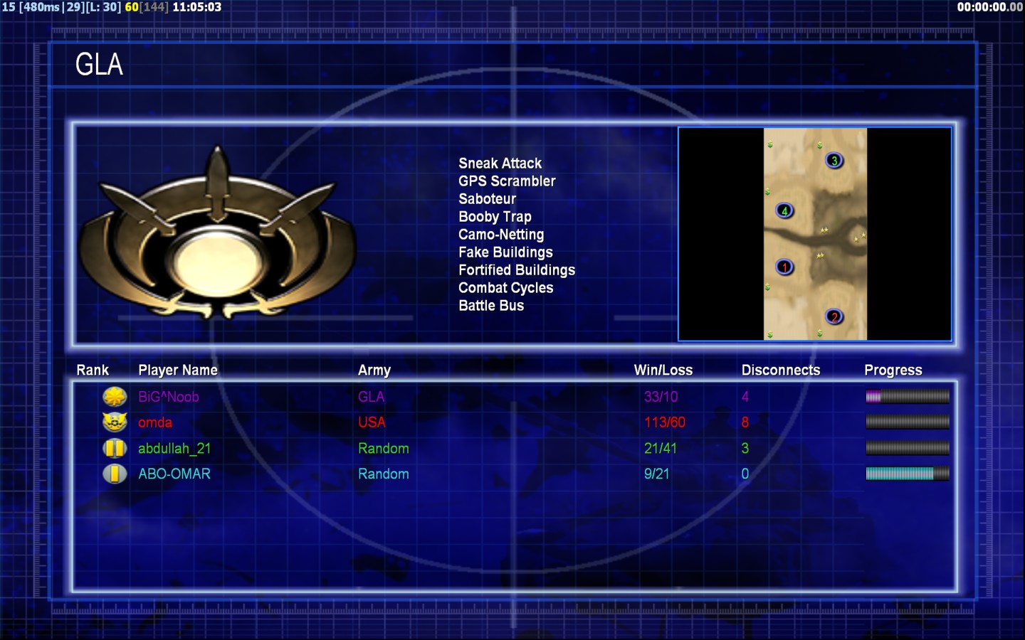 | NameABO-OMAR | Side | Color | Team1 | Starting Position0 | Buildings Built3 | Buildings Lost0 | Buildings Destroyed0 | Units Built8 | Units Lost0 | Units Destroyed0 | Money Earned0 | OutcomeWon |