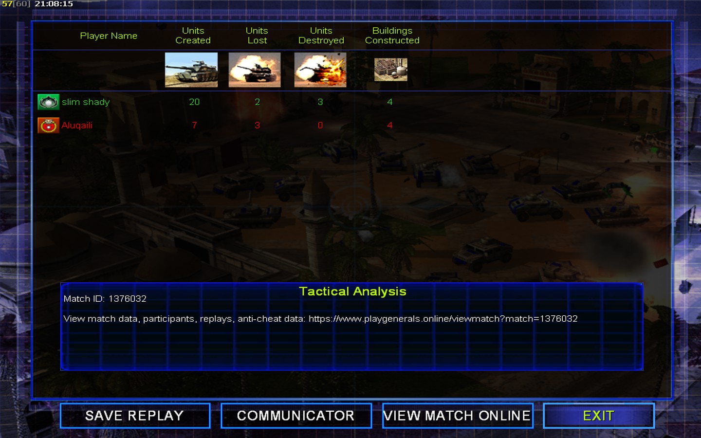 | Name | Side | Color | Team | Starting Position | Buildings Built | Buildings Lost | Buildings Destroyed | Units Built | Units Lost | Units Destroyed | Money Earned | Outcome |