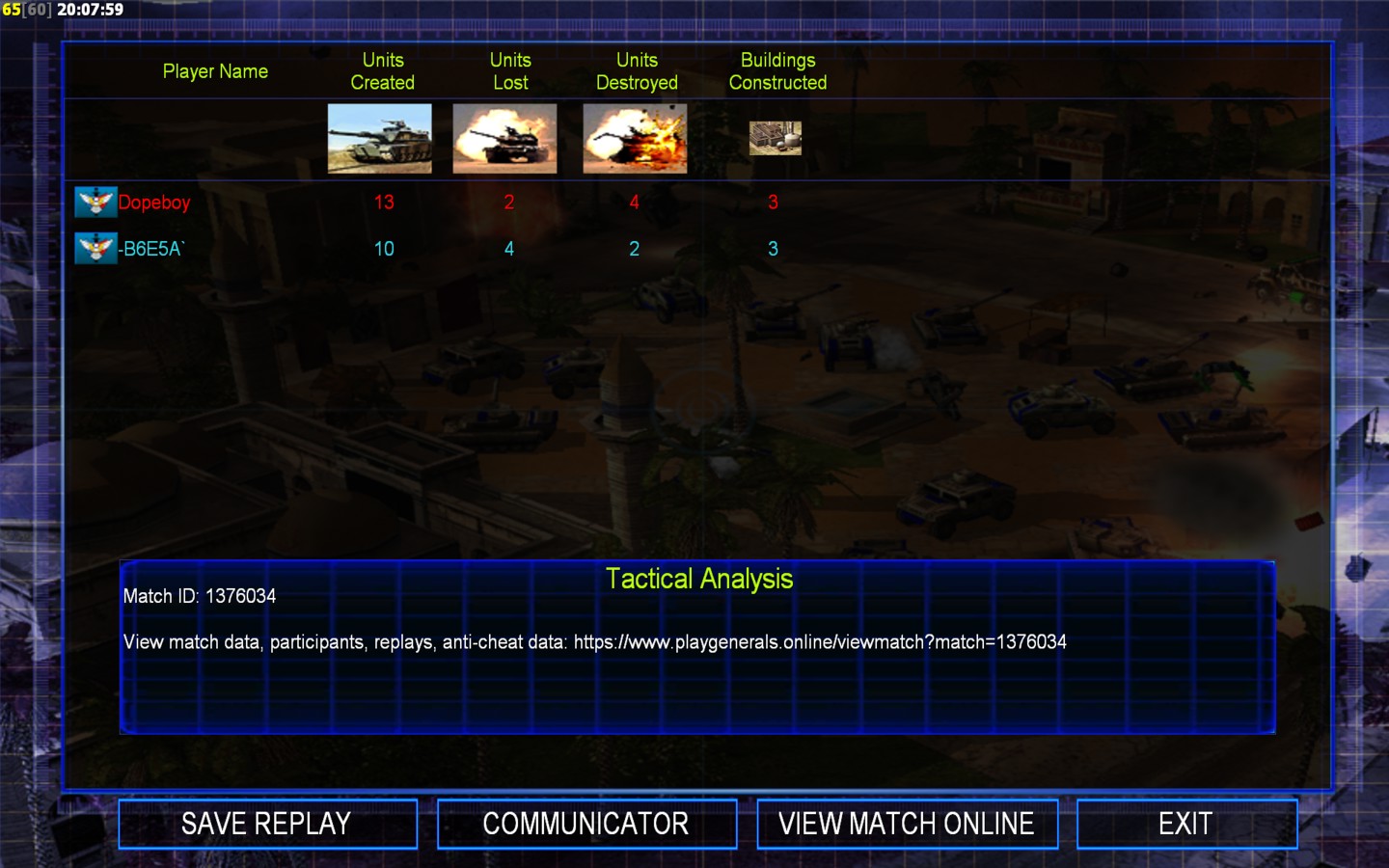 | Name | Side | Color | Team | Starting Position | Buildings Built | Buildings Lost | Buildings Destroyed | Units Built | Units Lost | Units Destroyed | Money Earned | Outcome |
