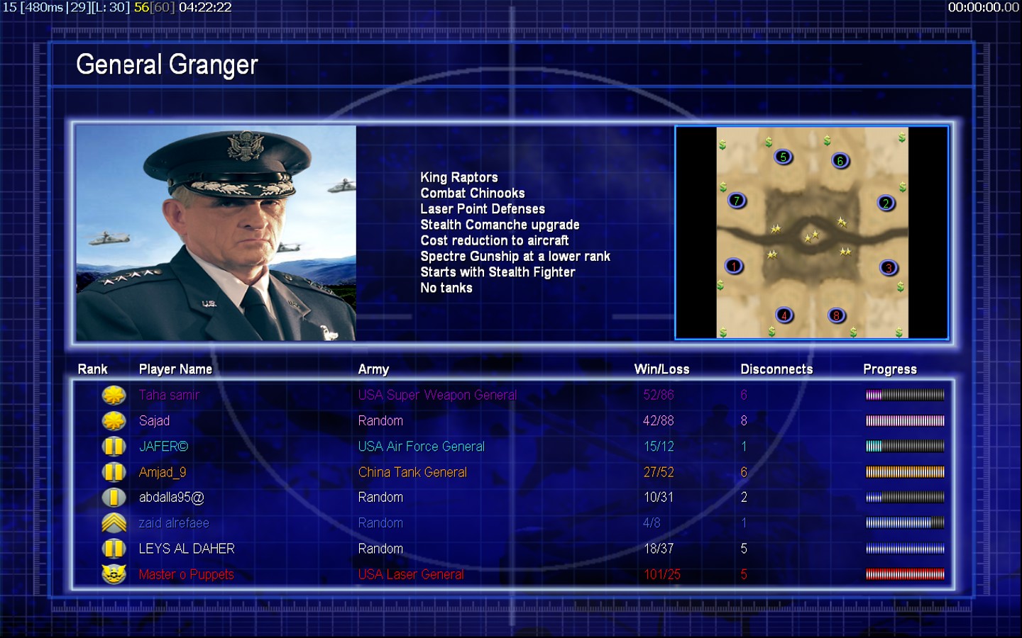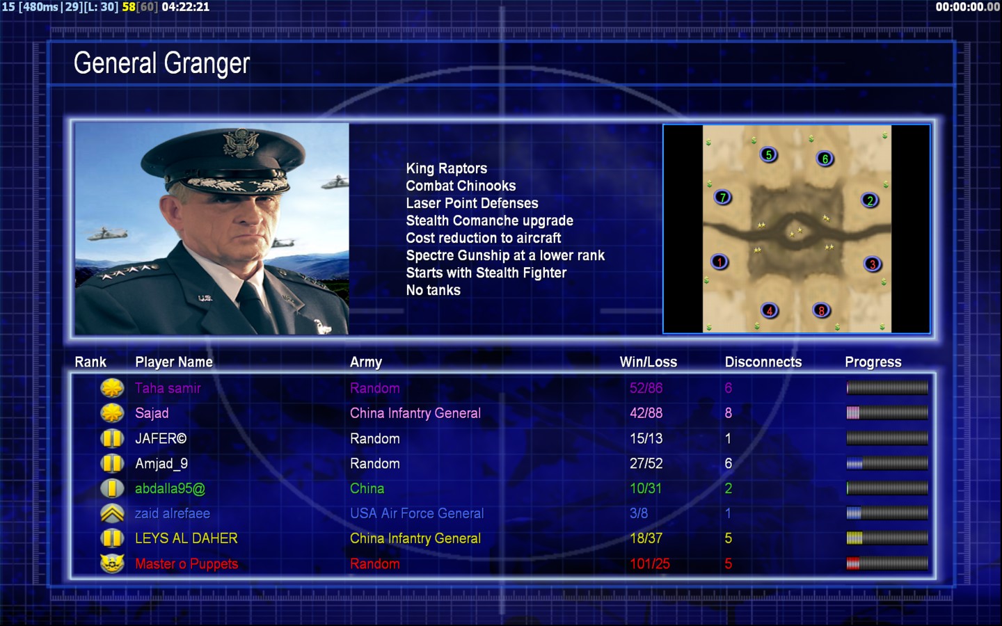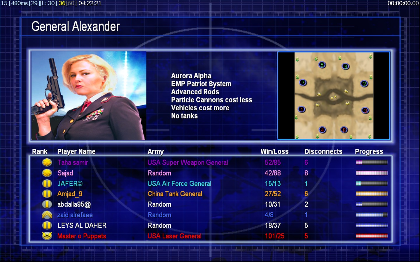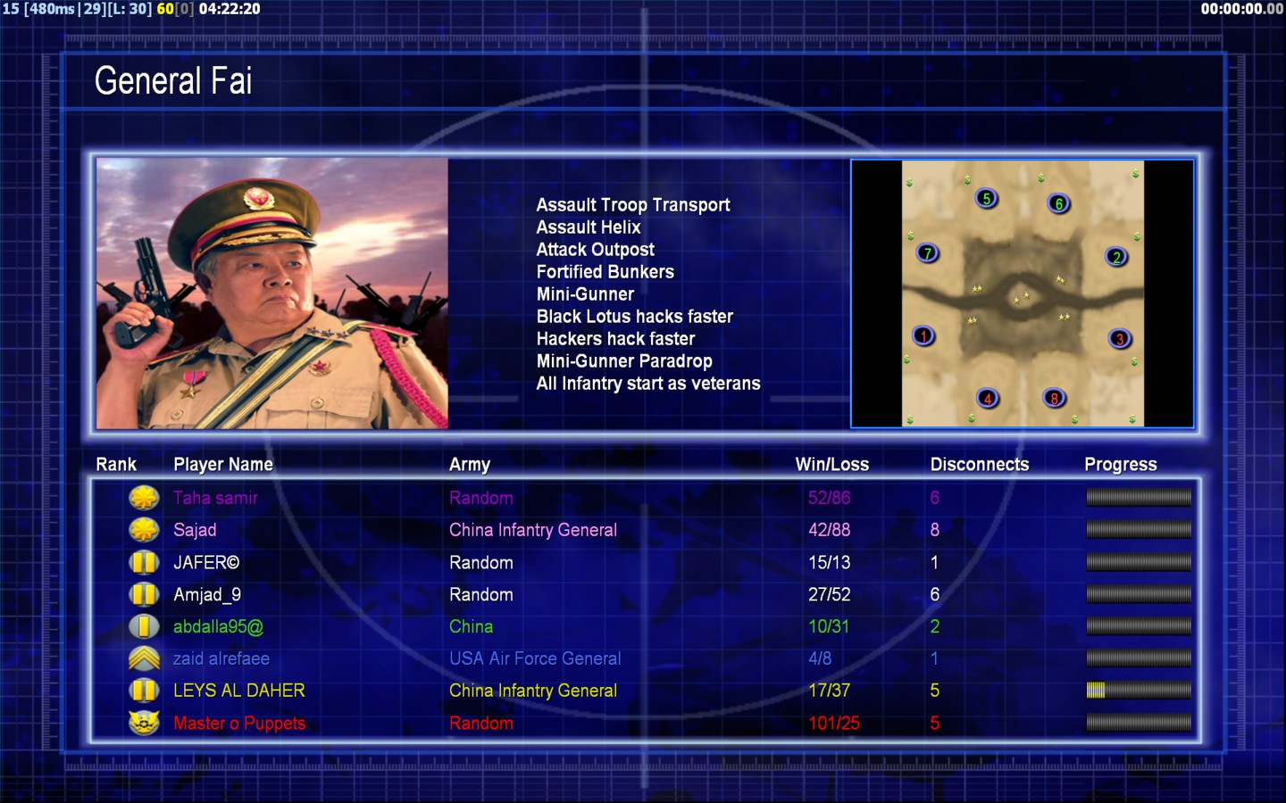 | Namezaid alrefaee | Side | Color | Team1 | Starting Position2 | Buildings Built25 | Buildings Lost21 | Buildings Destroyed5 | Units Built60 | Units Lost104 | Units Destroyed12 | Money Earned39900 | OutcomeLost |