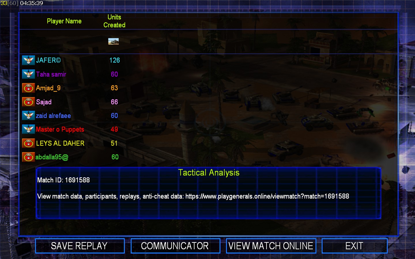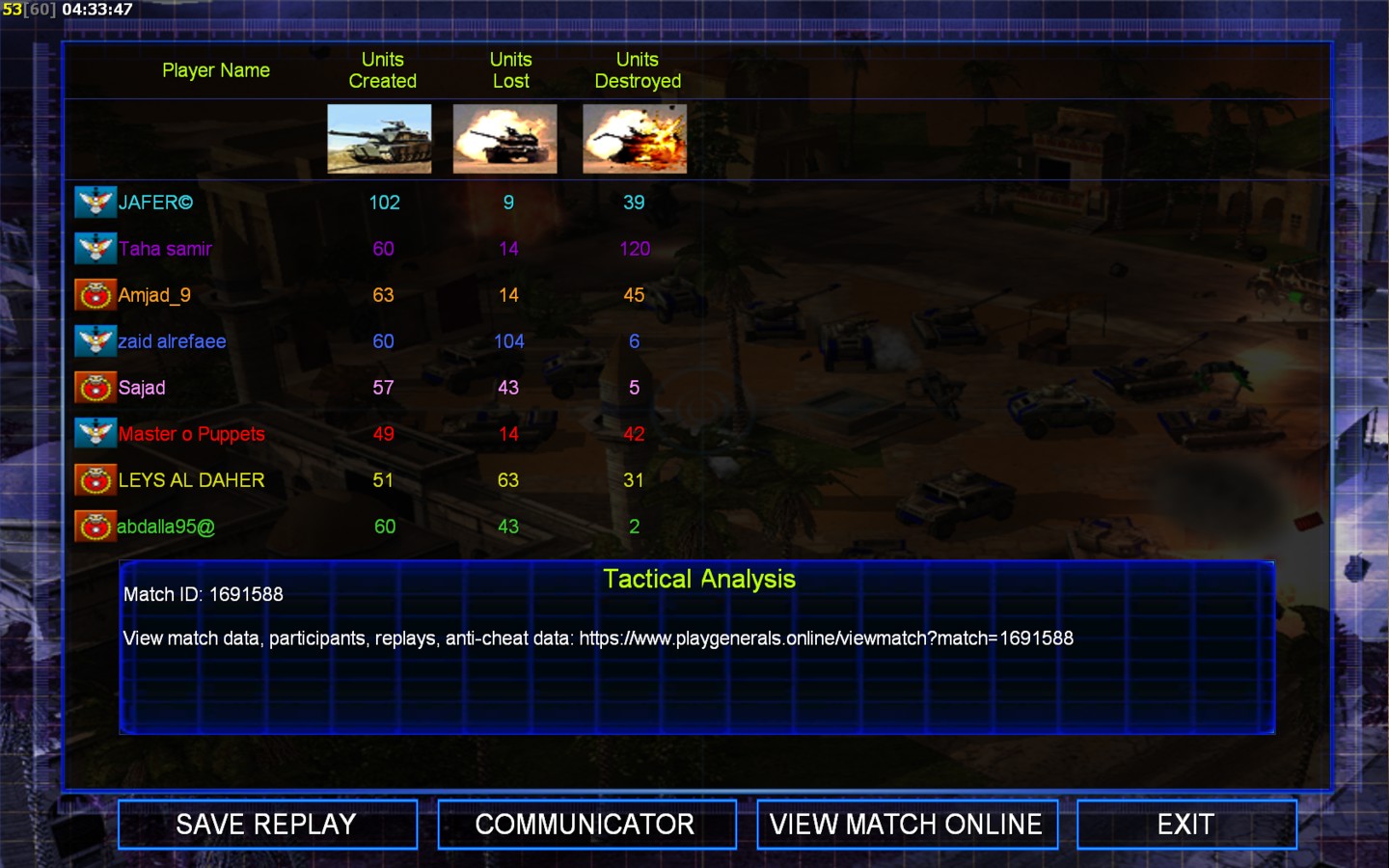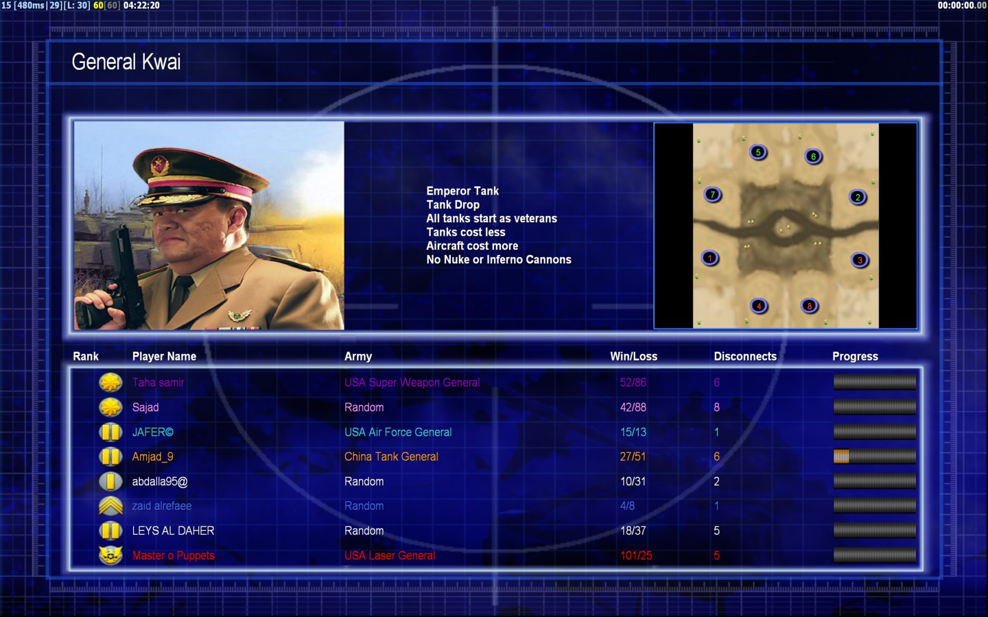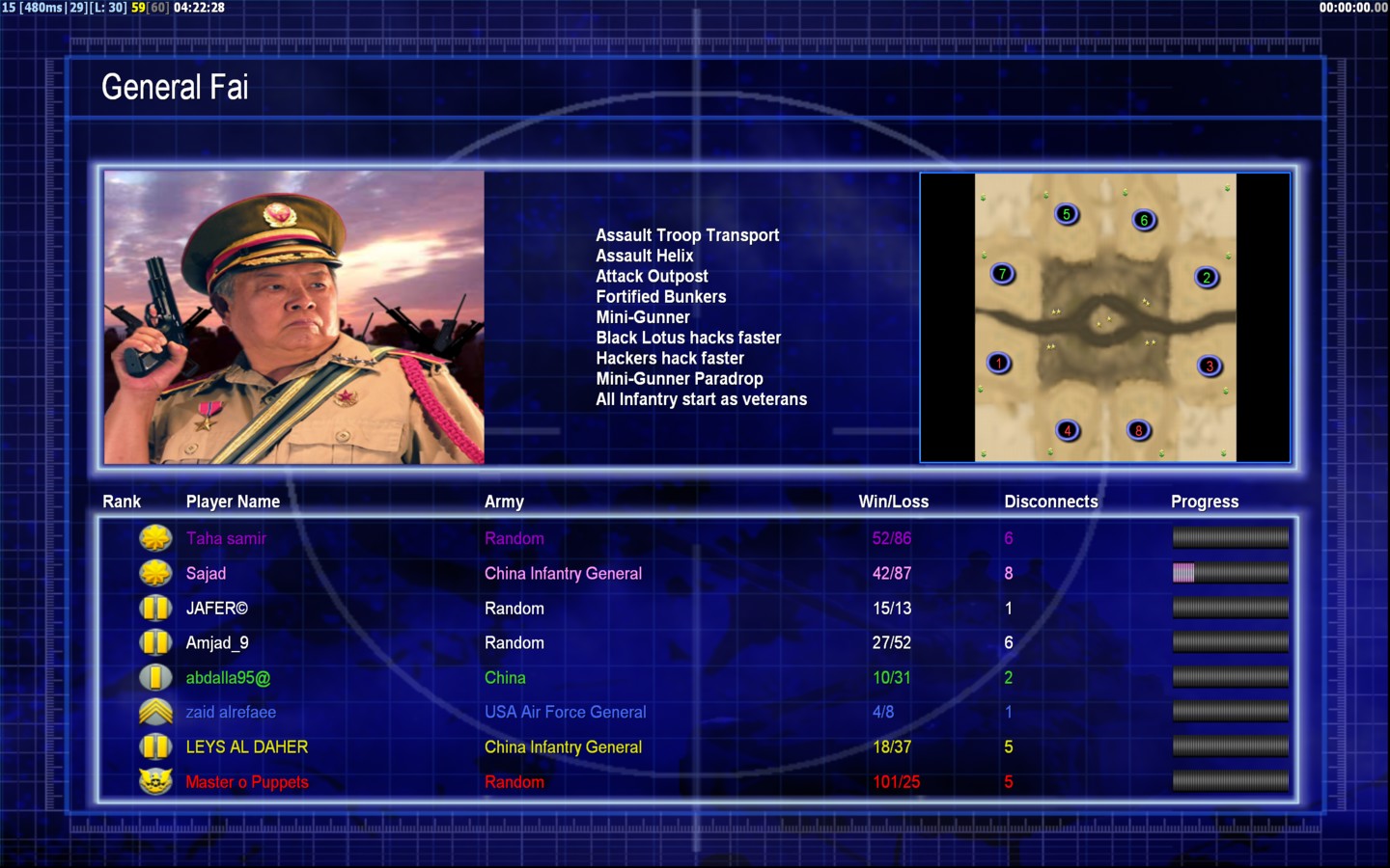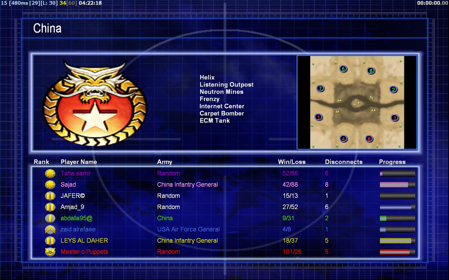 | Namezaid alrefaee | Side | Color | Team1 | Starting Position2 | Buildings Built25 | Buildings Lost21 | Buildings Destroyed5 | Units Built60 | Units Lost104 | Units Destroyed12 | Money Earned39900 | OutcomeLost |