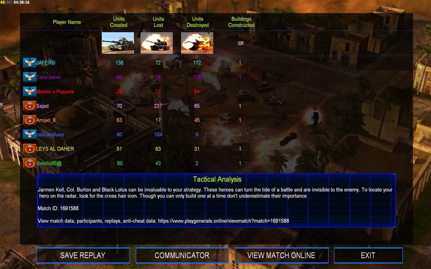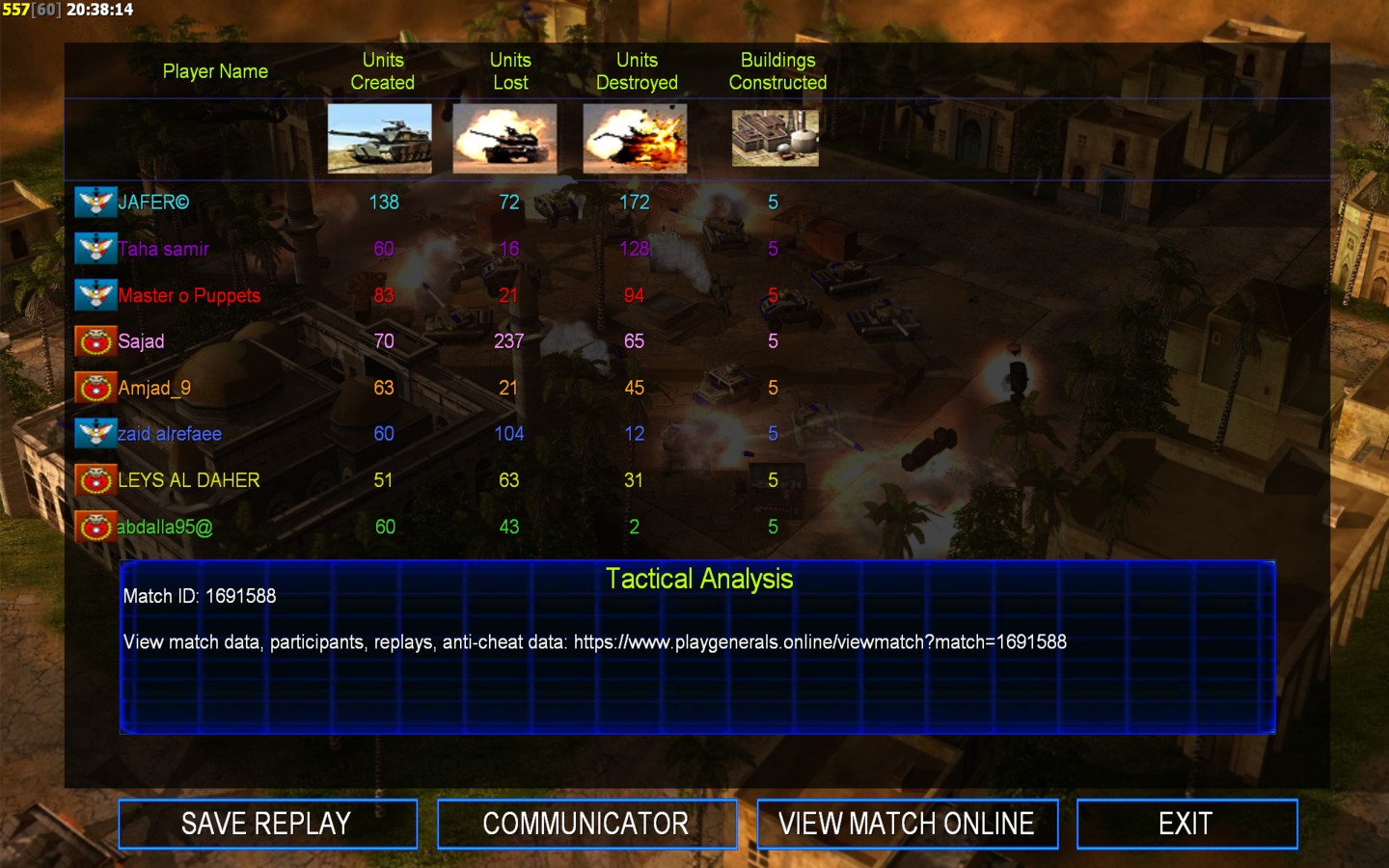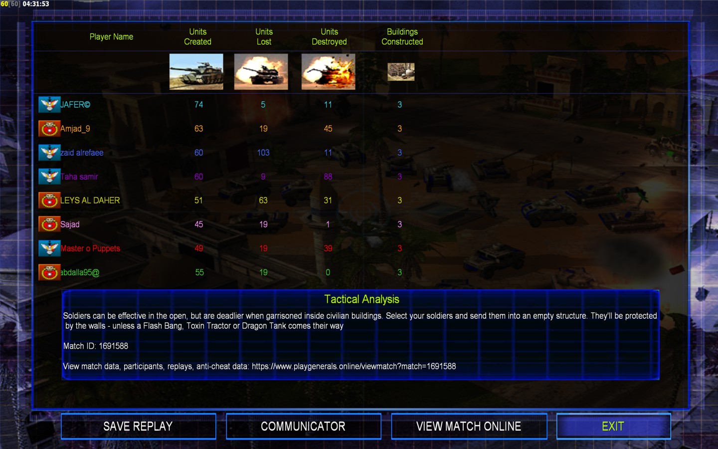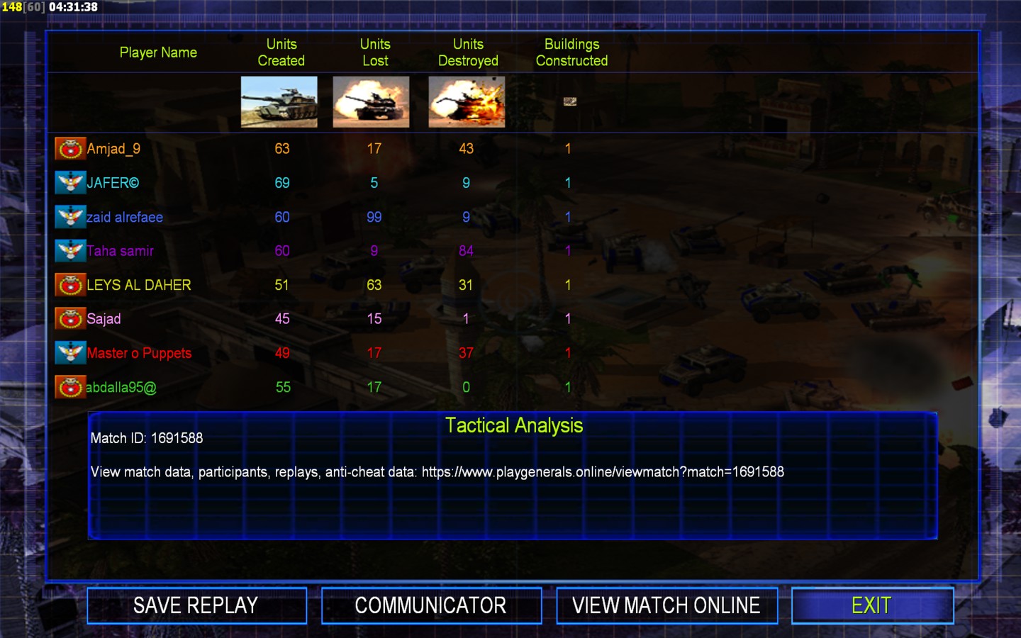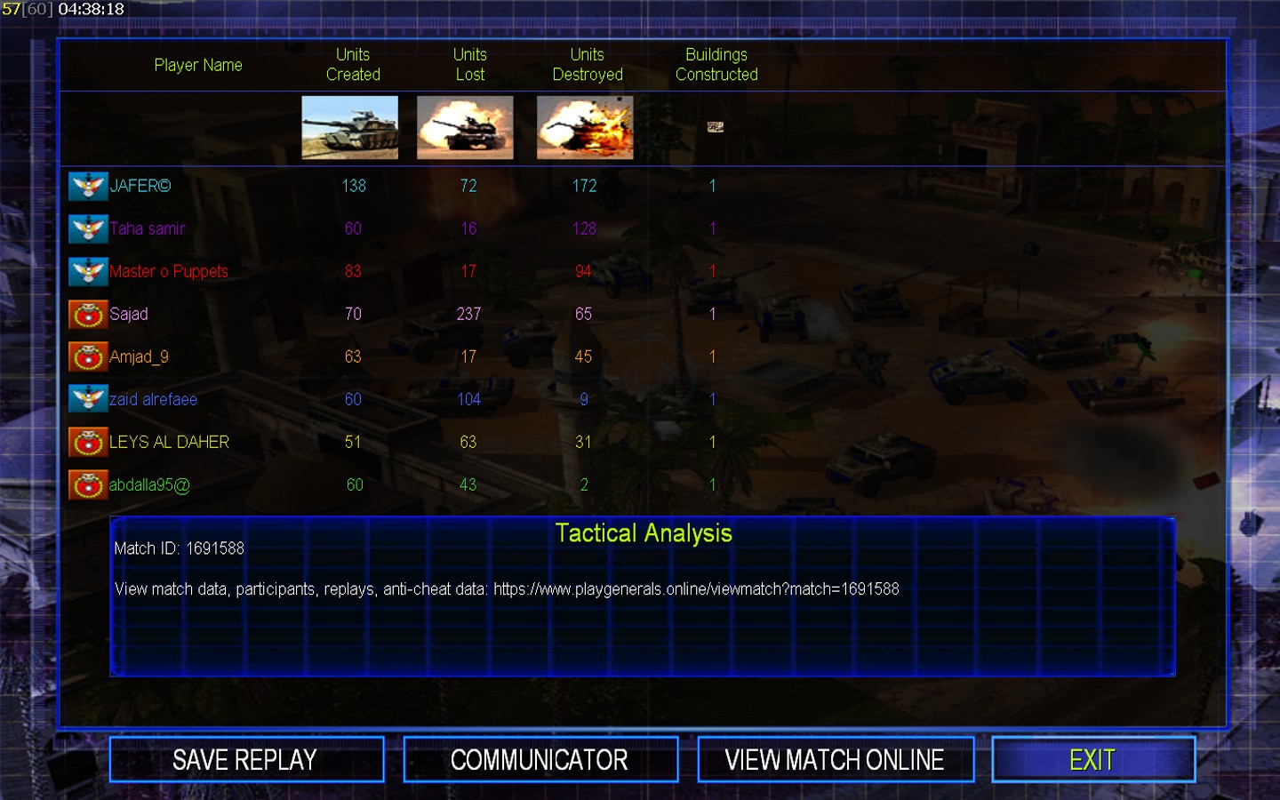 | NameLEYS AL DAHER | Side | Color | Team1 | Starting Position0 | Buildings Built20 | Buildings Lost14 | Buildings Destroyed0 | Units Built51 | Units Lost63 | Units Destroyed31 | Money Earned26424 | OutcomeLost |