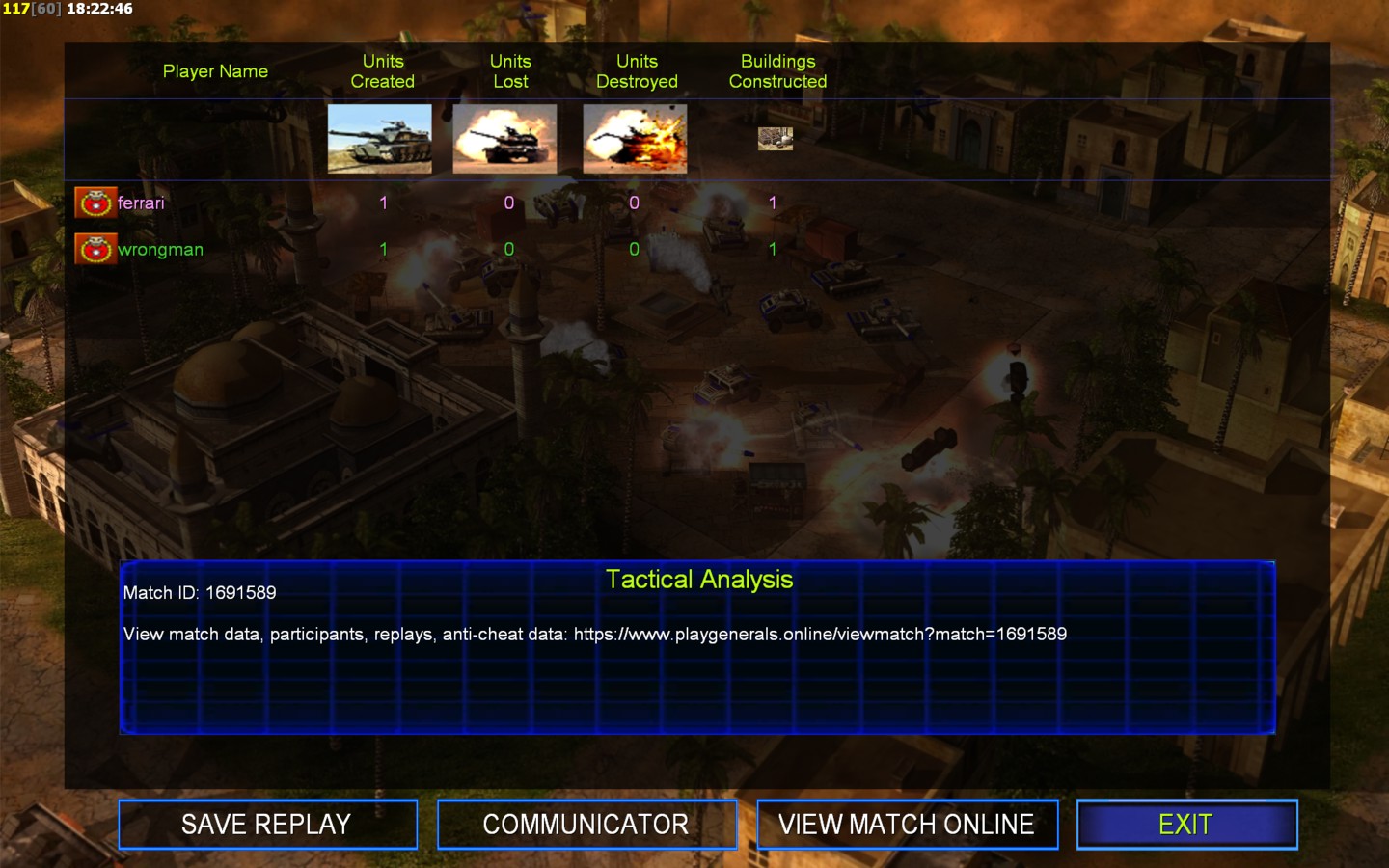 | Name | Side | Color | Team | Starting Position | Buildings Built | Buildings Lost | Buildings Destroyed | Units Built | Units Lost | Units Destroyed | Money Earned | Outcome |