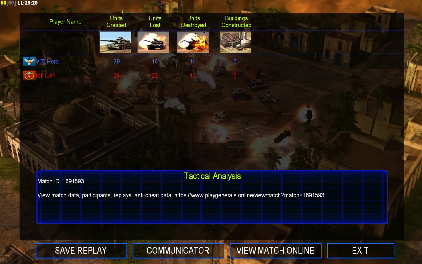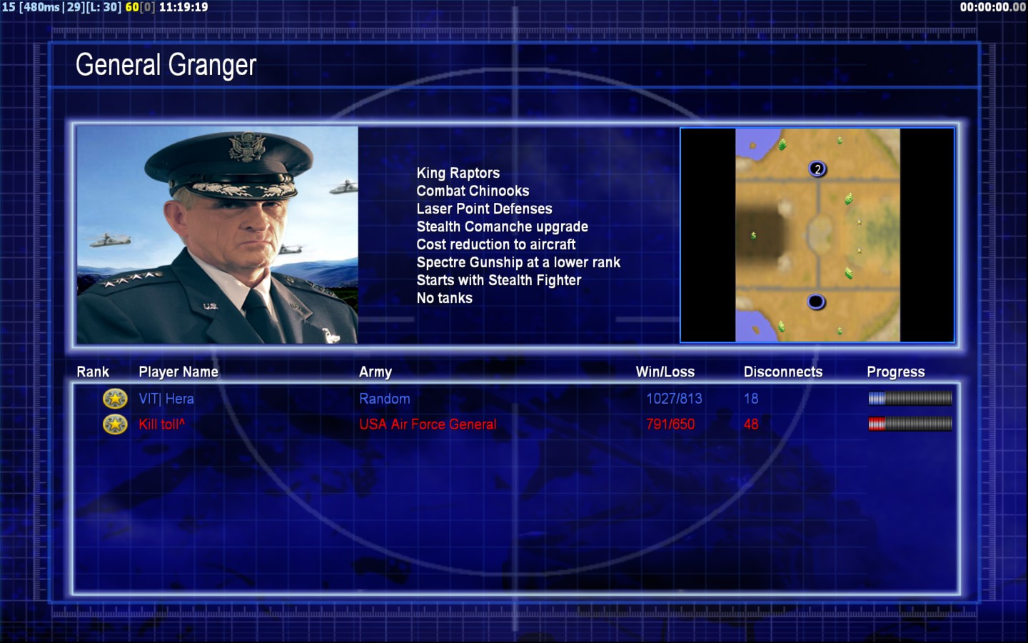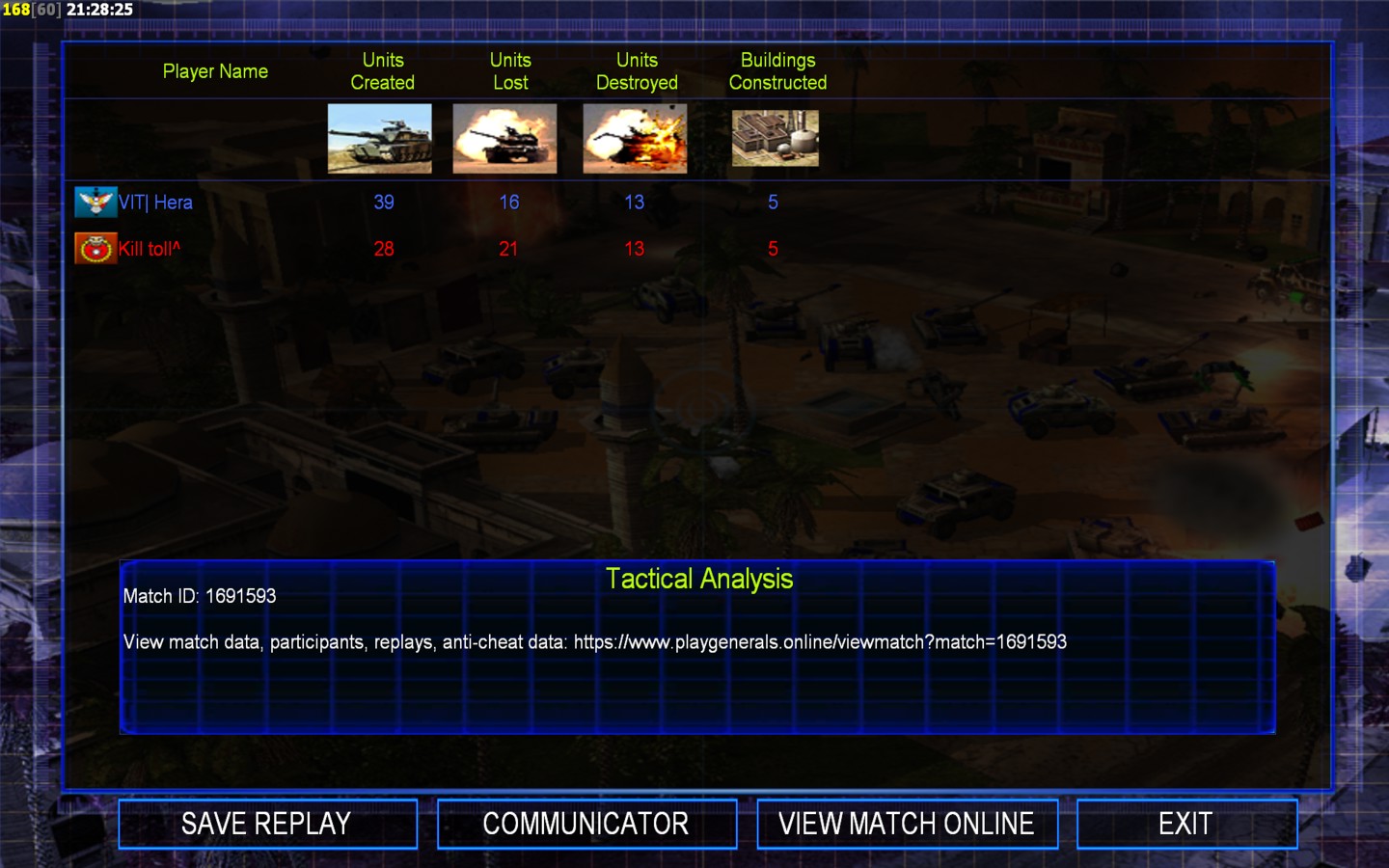 | Name | Side | Color | Team | Starting Position | Buildings Built | Buildings Lost | Buildings Destroyed | Units Built | Units Lost | Units Destroyed | Money Earned | Outcome |